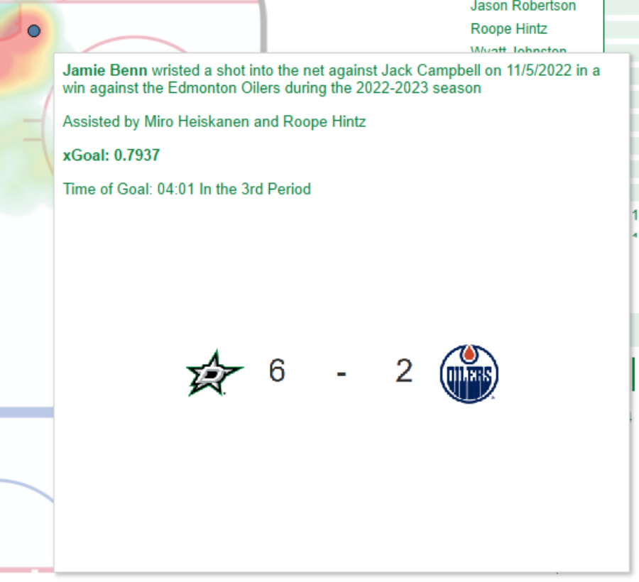 - Player specified metrics for all games (Time on Ice, Shots Taken, Goals, Faceoffs etc.)