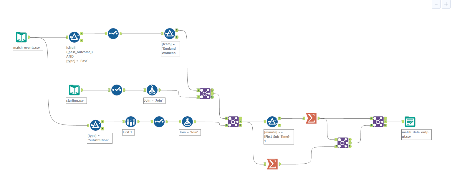 The top part of the flow connects to the raw match event data. We end up filtering for all successful passes (where the outcome is blank) and where the type of event is a pass.