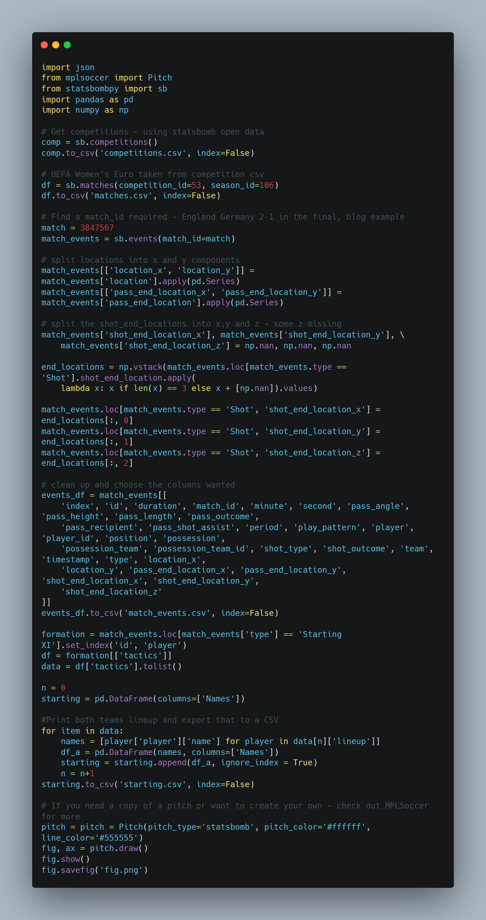 Line 50 onwards is really the only new part to the code where we are searching through a json to find the starting XI for each team. Reason being is when we build our pass network we will do it based on these 11 players.