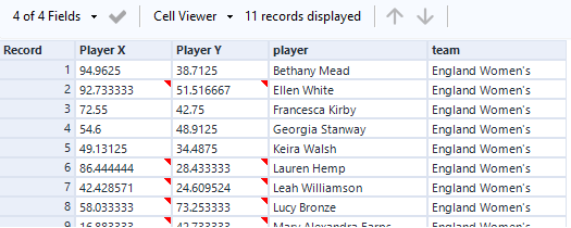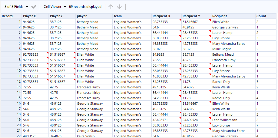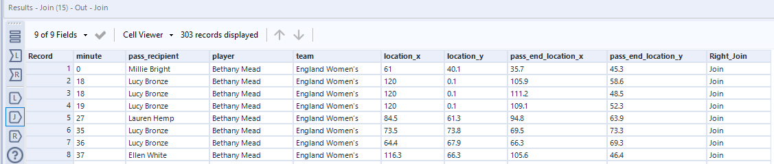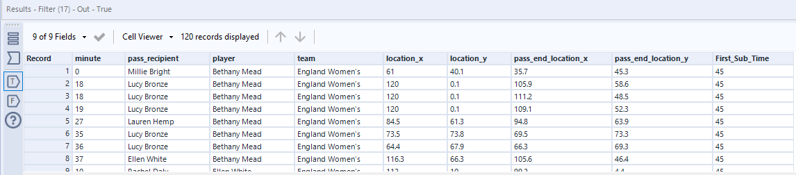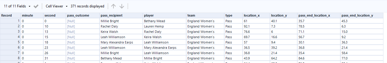We do a few transformations here just to tidy up some location X & Y values, as well as choose what columns we want in the data frame. Of course you can do this in Alteryx if you wanted but I had the code from a previous Intro to Statsbomb tutorial.