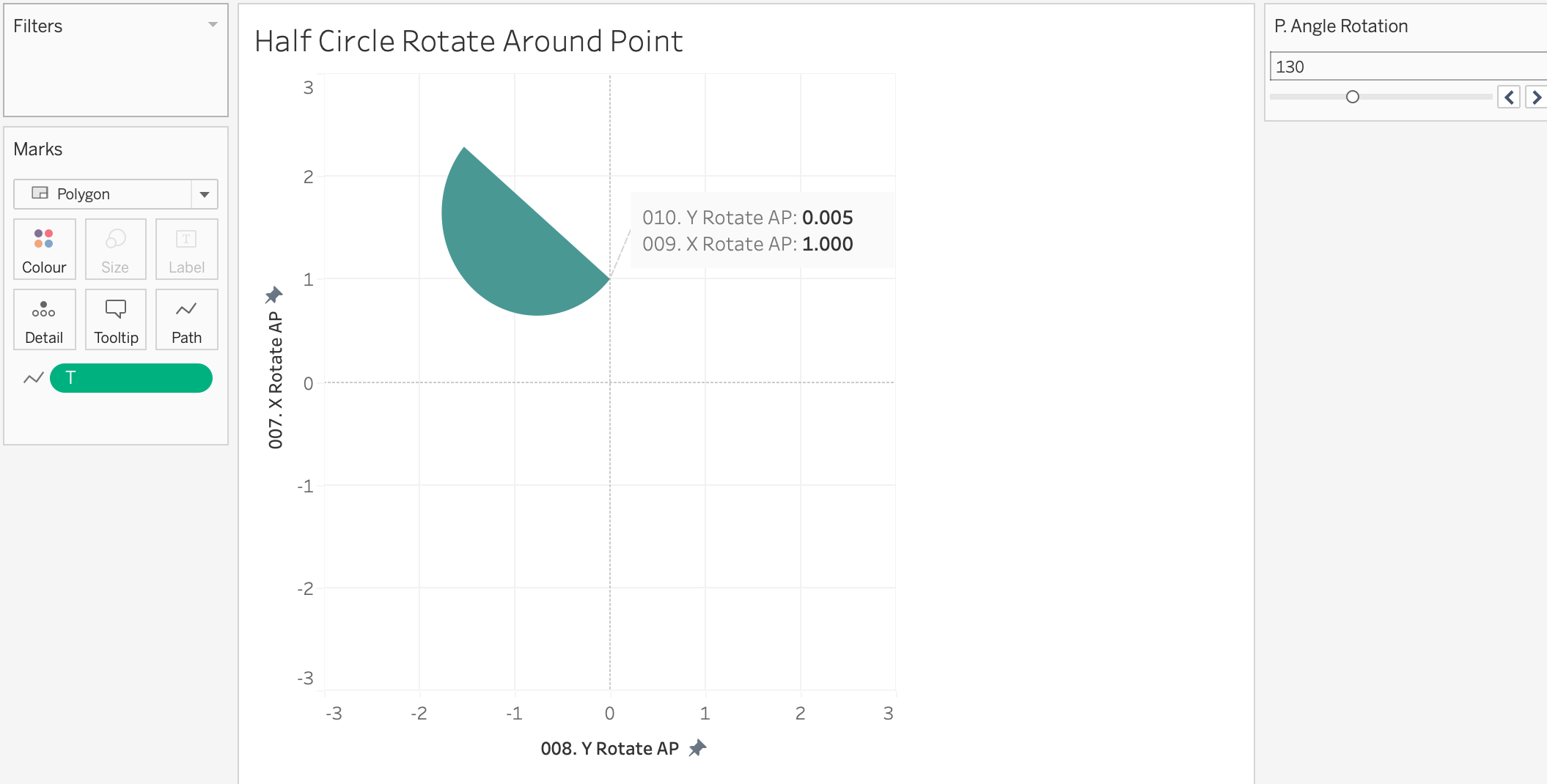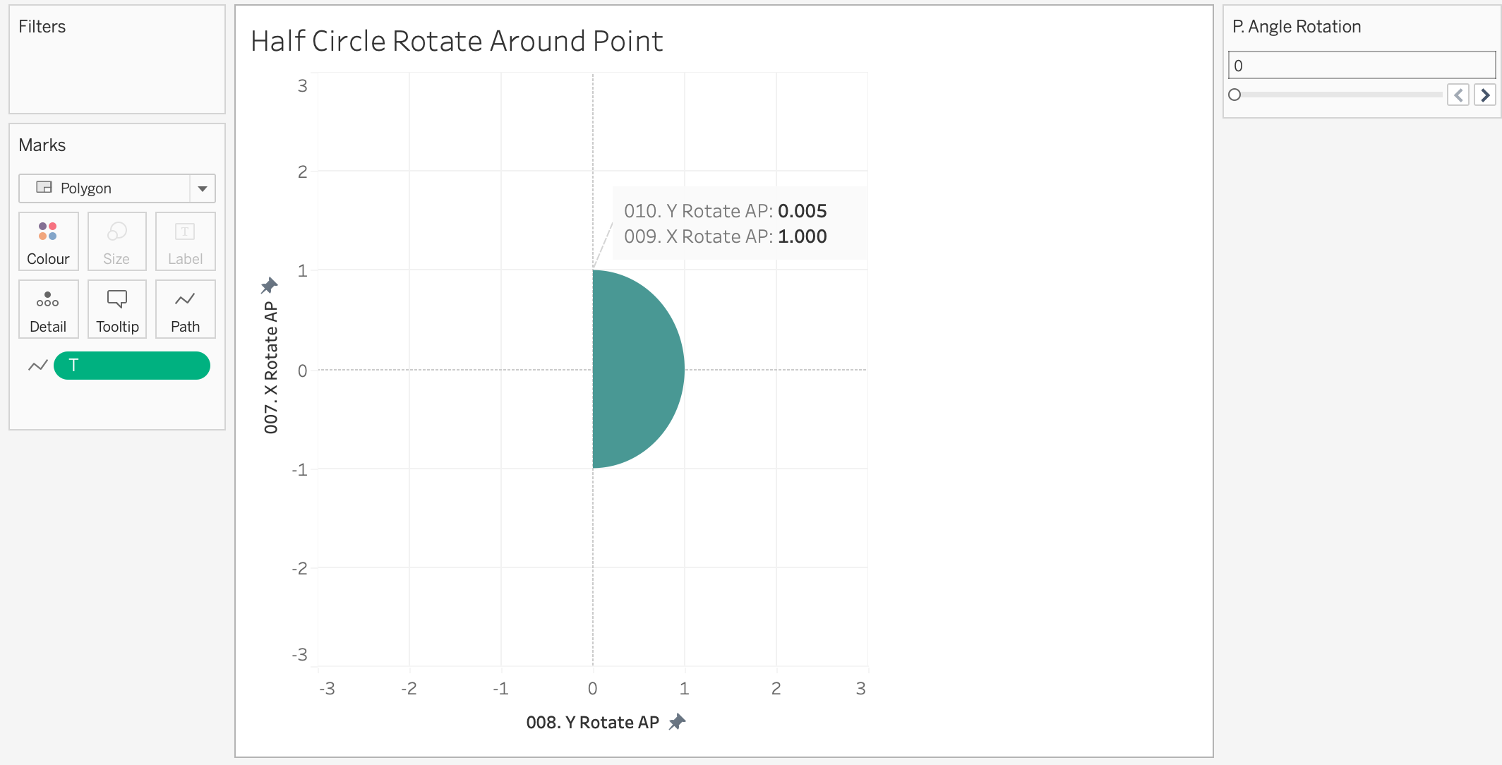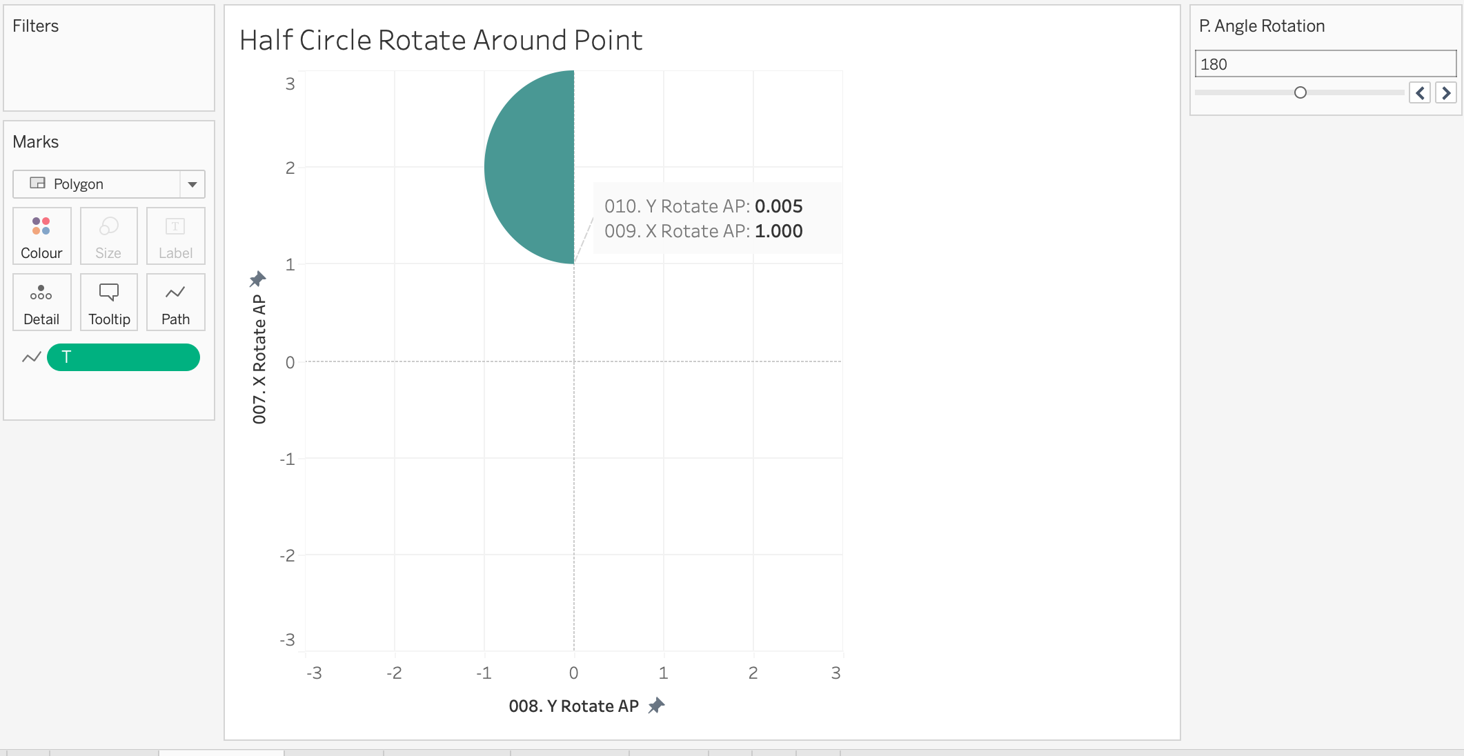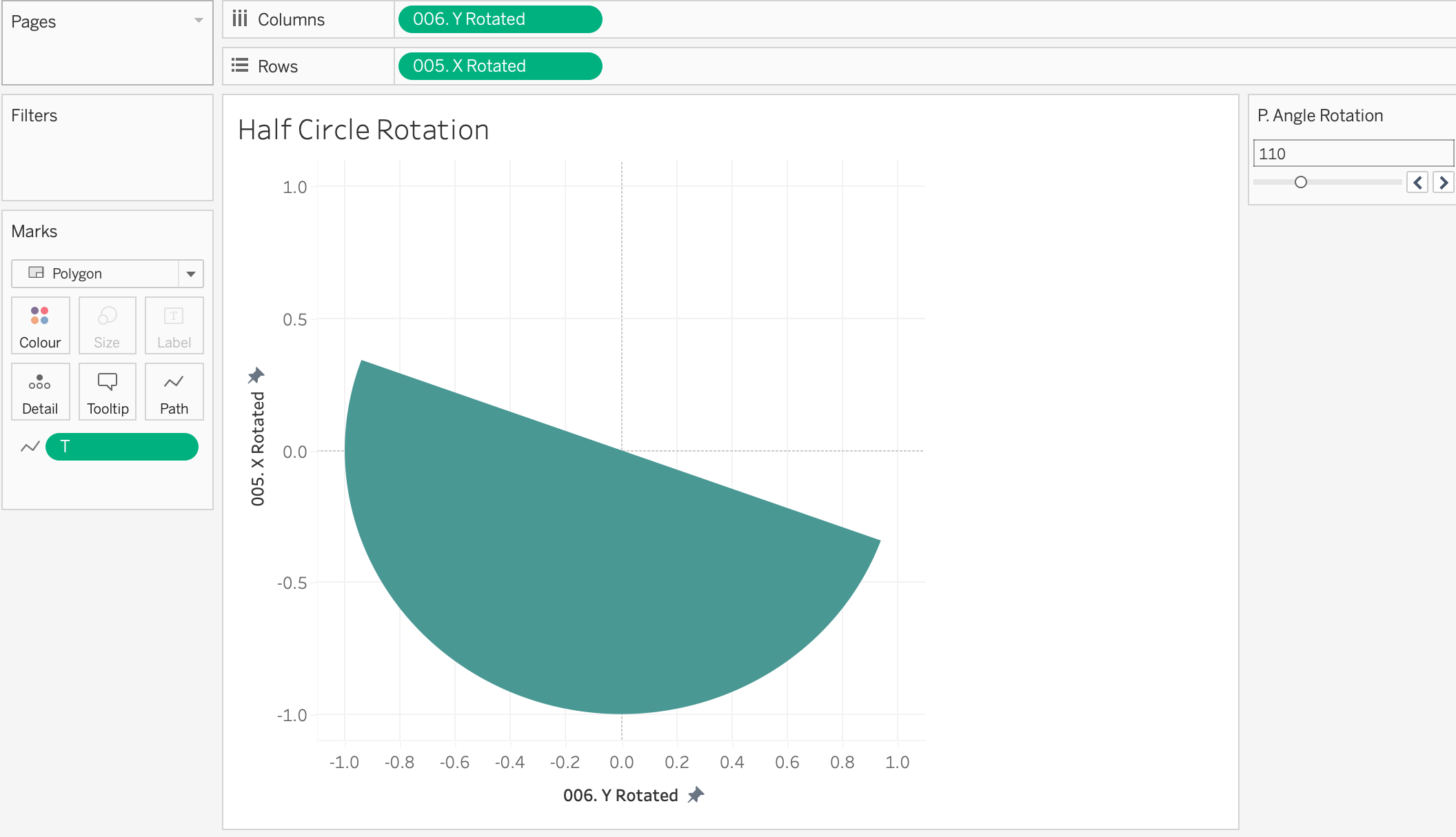 You will also see a column called 'proportion of full' - this is a hardcoded value I've used in order to size some of the semi-circles into random smaller values. The final viz uses the calculation of rotation around the origin (0,0), not an arbitrary point.