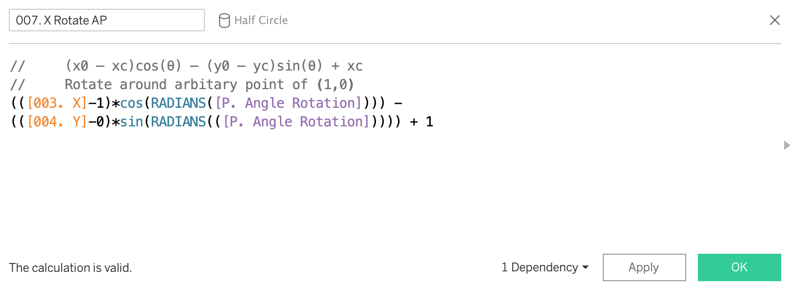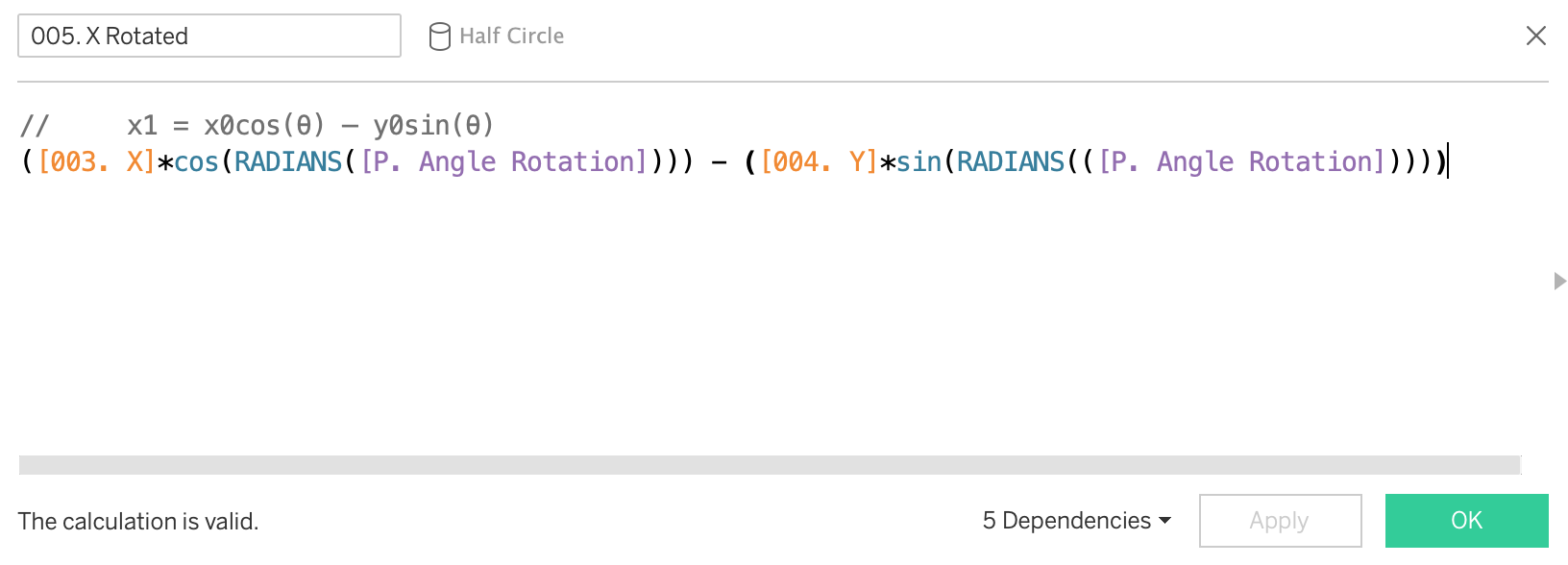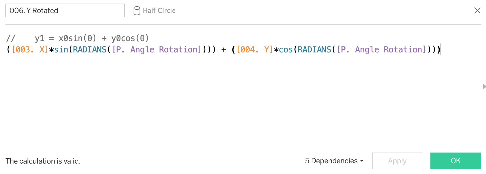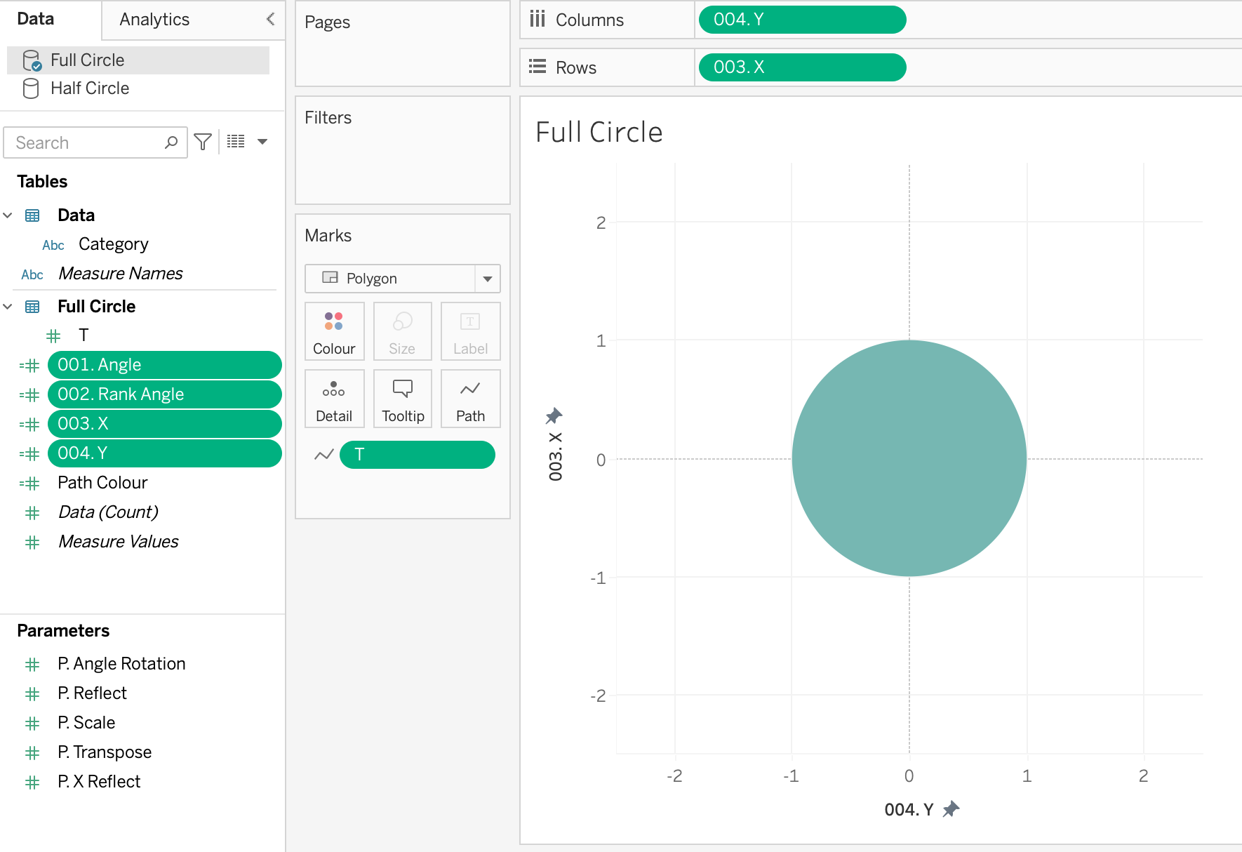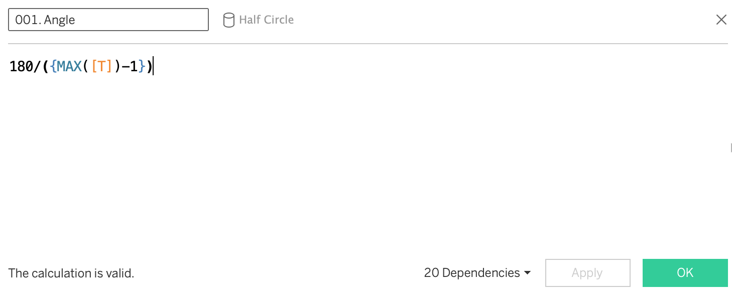 You will also see a column called 'proportion of full' - this is a hardcoded value I've used in order to size some of the semi-circles into random smaller values. The final viz uses the calculation of rotation around the origin (0,0), not an arbitrary point.