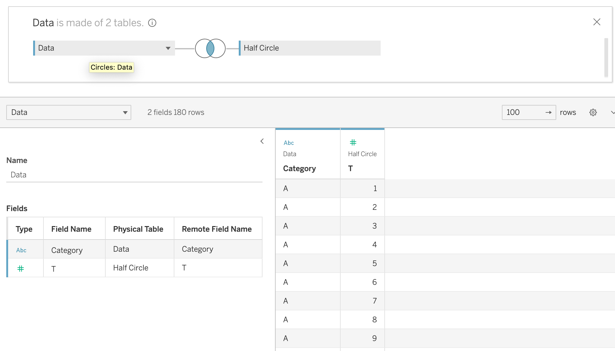 Join the Data to the half circle tab using a custom join of 1 to 1. In its simplest terms we have just made 180 points for what was a one row dataset holding just category A in it.