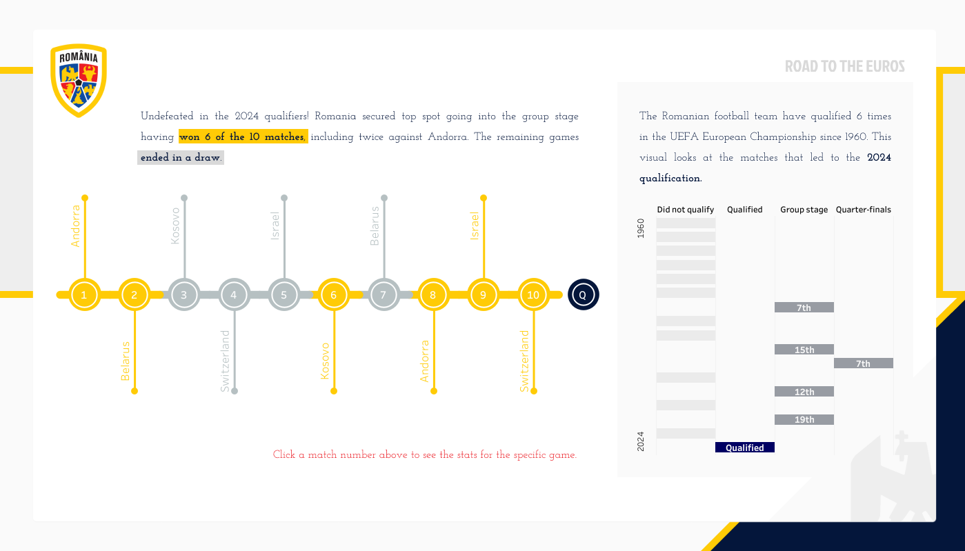 The first view is fairly simple. it is a timeline of the matches by game week using color to show the matches won, and grey to indicate the draws. So impressive that Romania won 6 of the 10 games to reach the group stages. This is the 6th time making the group stages, so added in the chart to the right hand side for context of highlighting what an exciting time it is.