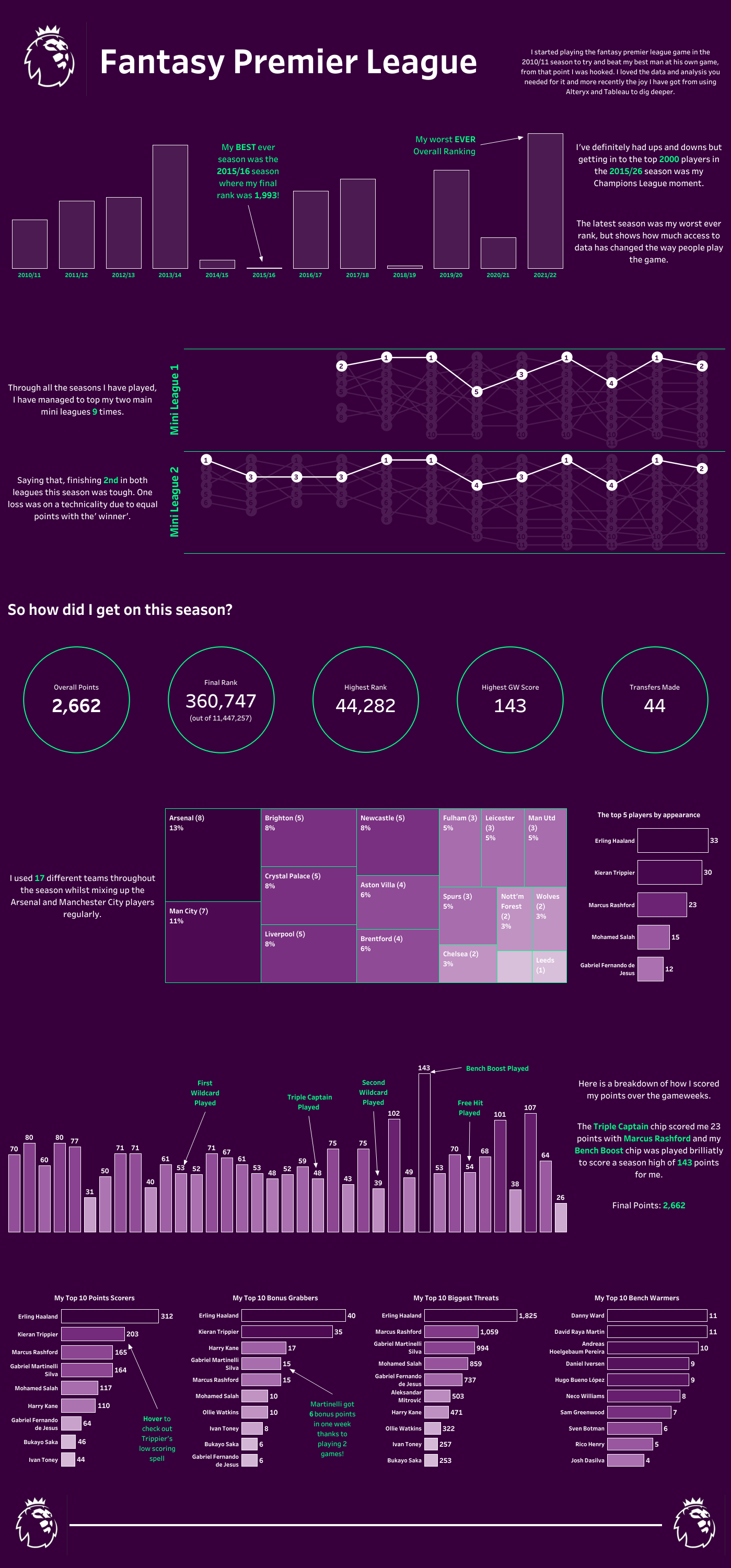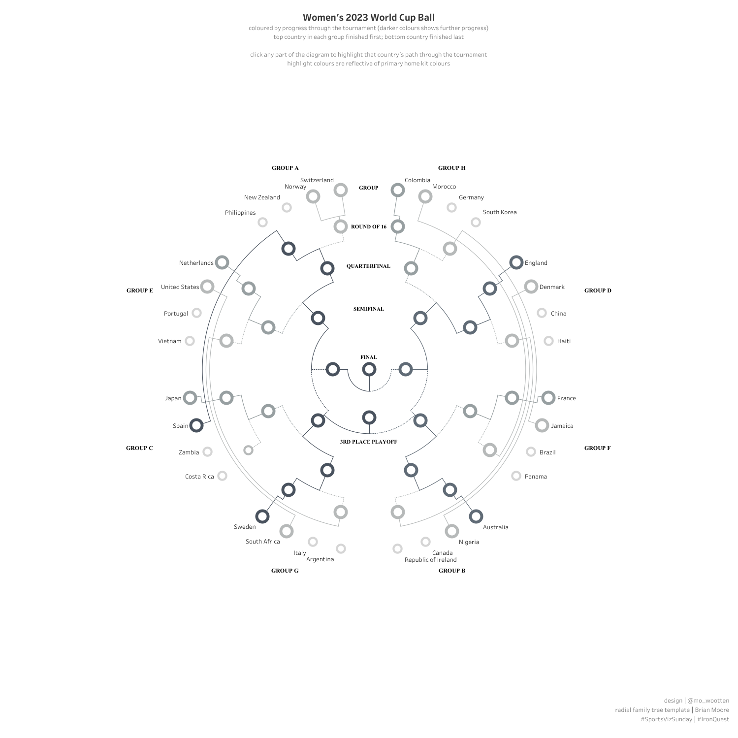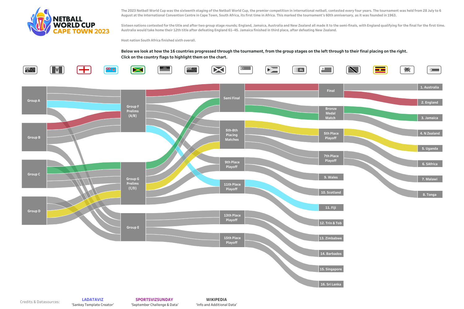 CJ: Is there anyone in the community that particularly inspires your work? Where do you look to for sports analytics inspiration?RT: You mentioned #SportsVizSunday at the start, which I found early on and loved it. There are so many great people contributing there with their own different styles about lots of different sports. Bo McCready’s Vizzes always looks like a piece of art which I love, Mo Wootten’s World Cup family tree really made me want to reverse engineer it and work out how he did it and I also love Ben Norland’s style of Vizzes. I’ve definitely recreated quite a few of the things he has done. His techniques are so unique.Outside of sport I love movies too so Zach Bowders Vizzes are right up my street. I’ve also spent a lot of time looking at #IronViz champion Chris Westlakes stuff and also Ant Pulley, I still don’t know how he makes some of his dashboards do what they do!There are so many great people out there though I find it hard to narrow it down. I actually made a Christmas advent calendar last year too. That was a little nod to a lot of the people who had inspired me to get better.CJ: You have two wonderful FPL visuals, one on draft selectionsanother based on your own data. For someone looking to do their own analysis what are the best steps to being able to create analysis to the detail level you’ve gone through?RT: Yeah FPL is a great competition. I only really got into it to try and beat my really keen football friends. The beauty of that was that I wasn’t swayed by any underlying loyalties and was happy picking players they sometimes wouldn’t purely on what the data was telling me.It’s a great resource for data. They have huge amounts of data and a load of API’s to go with it too. This makes it super easy to pull your own data. On top of that there are Alteryx workflows already built on the community for you to use with just a few simple changes.Once you have all that data the hardest bit is trying to decide what stats you want to use. I also did a viz on how our current draft league was going, but it was a bit biased to be honest and I built it to make myself look better than I was actually doing at the time, mostly to wind up my mates.CJ: Your Netball visual with the Sankey is beautiful in design. Thank you for entering that #SportsVizSunday challenge. Can you talk us through the design choices? Particularly the choice of flag and use of gray color? What is it that you wanted the user to understand through it?RT: Thanks, yeah I was particularly pleased with how that one turned out and the challenge was a fun way to use a dataset I probably wouldn’t have picked.Part of the design was me wanting to use two things I hadn’t done before; multi select parameters and a Sankey. Tristan Guillevin’s amazing tool helped me get the basic template without having to do all the painful maths. From there I then added a load of functionality with the aim of allowing the users to select any countries they were interested in. The grey scale/colour selected for each country would then really make their progress through the tournament pop out to the viewer. The choice of flags as the selection tool felt almost natural but also made it easy to get them all above the Sankey in a nice uniformed format, keeping my inner OCD happy.CJ round-up: