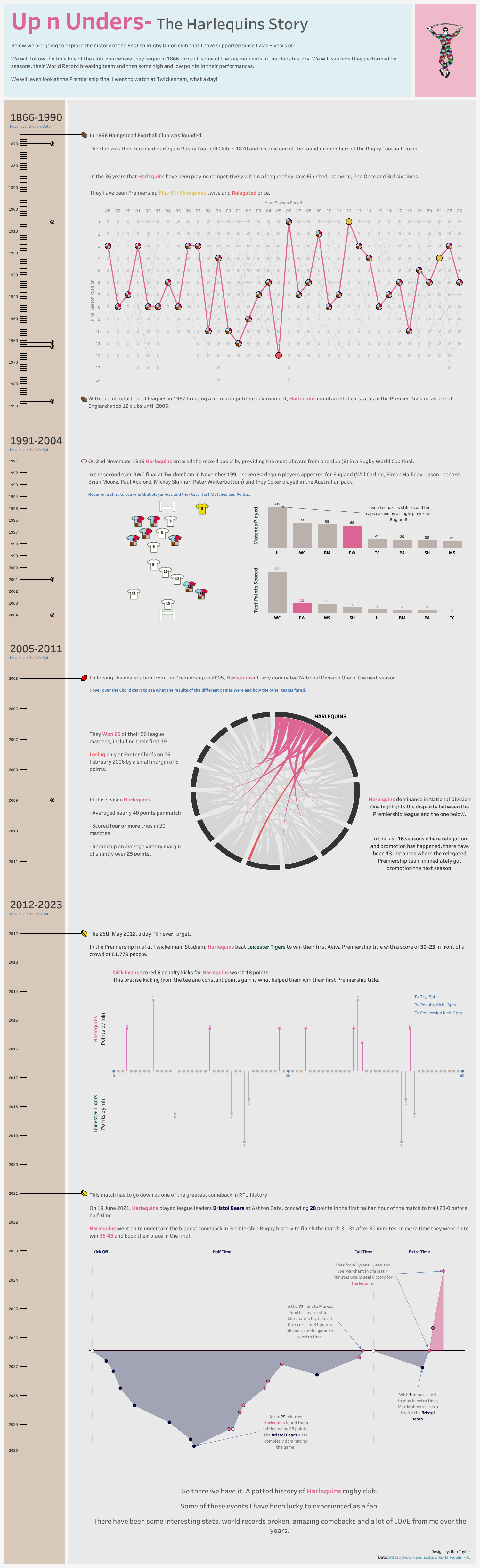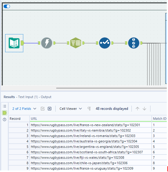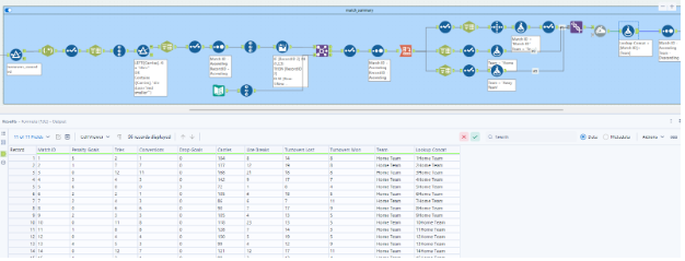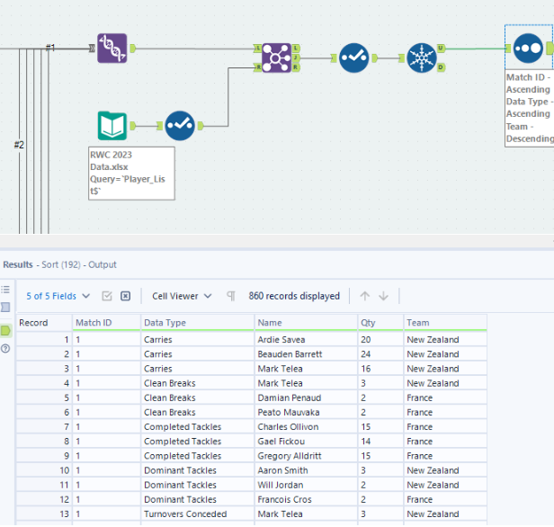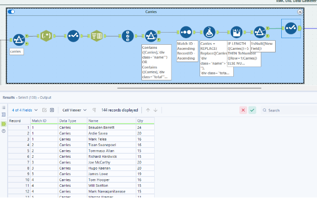 CJ: Rob, thanks for joining. I am so pleased to have a #SportsVizSunday regular join the blog today. For those who don’t know, do you want to share a little bit about your journey at LNER & JLL, and where your interest in data started?RT: Thanks CJ, it’s a real pleasure to be invited on to the blog so thanks for having me! I’ve always been interested in numbers, I’m a very methodical person and love problem solving, numbers just make sense to me. But I also have a real creative passion too. In a former life I used to paint pop art style paintings of high profile rugby players that would be sold off at charity auctions.I started my analytics career over 16 years ago in excel, automating data processes with macros and VBA. Being able to speed processes up and get to answers quickly was fantastic and I loved doing it. During my time with London North Eastern Railway, LNER, I was instrumental in how they transformed and used their data. We got Tableau and Alteryx and that’s when I knew what I wanted to do and my career path really took off. Building out all sorts of ETL processes to manipulate data so that we could use it in Tableau ticked the methodical part of my brain, then creating really interactive and insightful dashboards the business could use ticked the creative side.About a year ago a colleague, Danny Bradley, introduced me to the datafam and I realised there was this whole bigger world outside of LNER. I was amazed what other people were building and what they could do with the tool. I wanted to be part of that. My recent move to JLL gave me the opportunity to work for a big business and stretch my skills, whilst also getting to work alongside so many of the datafam community I’d come across in the last year. There are so many opportunities for learning and skill growth I can’t wait to see where it takes me.CJ: You are a big rugby fan. I particularly remember your Ironviz entry on the love for Harlequins, as well as a shortform visual on the comeback quins. I particularly love the Comeback quins visual way of showcasing the shortfall of 28 points to then going all square before the final whistle. Can you tell us a little more why you felt this was the best representation of the match data?RT: Yeah rugby has been part of my life since I was 6 or 7. I have played it since then and watch as much as my wife lets me!Like most sport, in rugby not all games are thrillers, however with this one in particular the way the game panned out it was such a gripping game. After 29 minutes and being 28 points down most people would think it was a done deal. For me that was when the story really started. That was why I thought this chart worked so well. Using the horizontal divider for each team was a conscious decision, which I thought really highlighted how big the points gap got. The beauty of doing it this way and also colour coding the areas also gave me the opportunity to show just how much of the match Bristol were ahead for. There was only a short period of time in the initial 80 minutes where Bristol weren’t winning, 3 minutes!! Then again in the 20 minutes of extra time Bristol led for 16 before Harlequins clinched the win. I can only imagine what the atmosphere change must have been like in that stadium between the two sets of fans and that was what I was trying to represent.CJ: For other rugby fans, what are your go-to data sources? How much data prep would you have to put into a piece such as your scores and stats tracker that received VOTD? Was this something you automated as the tournament was on?RT: For me it can be anything from a properly collated data source that I find like rugby.statbunker.com to just websites that I come across that are based on tournaments or competitions. This was particularly the case with the World Cup one. I came across a website that had all the information that I needed and was almost updated in real time.This for me is where the data prep comes in and my love of problem solving. My go to tool is Alteryx. From the first time I used it I was blown away with its capabilities and ease of use. Much like Tableau there is a great community out there where much cleverer people than me have done some amazing things. I used it to build out a workflow that would scrape all the different parts of the website I needed and collate it all together in a friendly Tableau building format. The initial build took a bit of time but it was on purpose so that it was future proof. The beauty of this was that as soon as each game ended I could run my workflow and update my dataset and refresh my dashboard. I think it only needed a few small tweaks as the tournament went on because of the initial time investment.I watched a lot of the games and the data geek in me couldn’t help running the workflow straight after to see what the stats showed and how it compared to how I saw the game.Here are a few snippets of the workflow I used. The first part involves me getting the URL’s for all the individual games. This was initially scraped from the landing page on the website and combined in to a list so I was future proofed for when new games happened.Once I had those I could put them through the download tool and start parsing out just the data I wanted to visualise. I did that mainly using the Parse tool and text to columns, then a few different calculations to focus on the number I wanted to get. In this case how many carries each player had in each game.This was repeated for all the different metrics and then unioned back together with a Player details list I also scraped to combine all the data in one file.Finally I did something similar with the actual Match data to combine it all together in one easy to use file so I could plot the game info on the dashboard.CJ: Rob has kindly shared the workflow with us, and is downloadable at the top of the page from the git repository.
