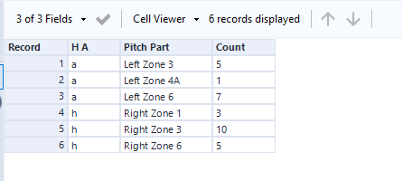 You can see how I've offset the stacking of the data. Do note also I've brought in all the pitch details too regardless if a shot wasn't taken in the specific zone or not