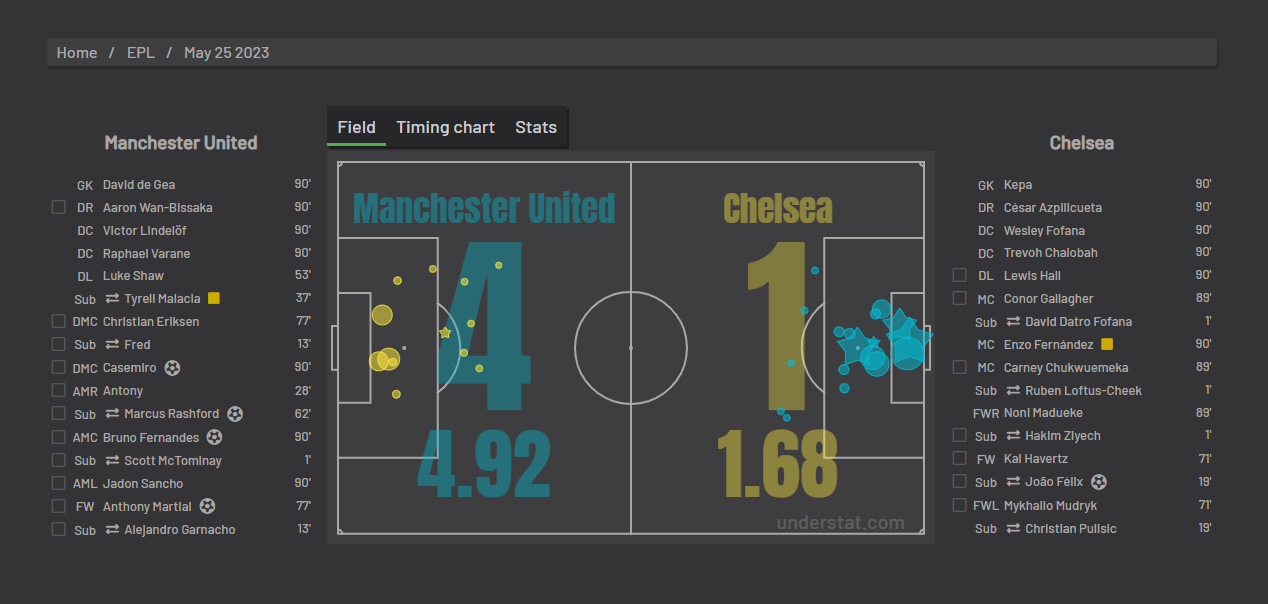 We connect to our EPL shot location data and choose a specific match, in this case I've chosen the match between Manchester United and Chelsea here.