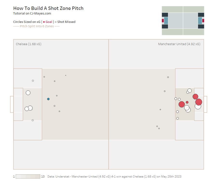 The beauty about the workflow is you will only need to amend the input data for the shot locations at the start to be able to change how the output looks. In this case i've broken the pitch into 6 zones. Zone 1 is in front of the goal. Zone 2 is in the 6 yard box but not in line with the goal, Zone three backfills to the top of the box. Zone 4 either side fills the remainder of the box. Zone 5 is within the flanks, and Zone 6 is anything behind the box. Perhaps if you were to take this further you may split zone 6 into a 7th zone if you want to emphasis shots taken just outside of the box. Given the above diagram, this can easily be done!