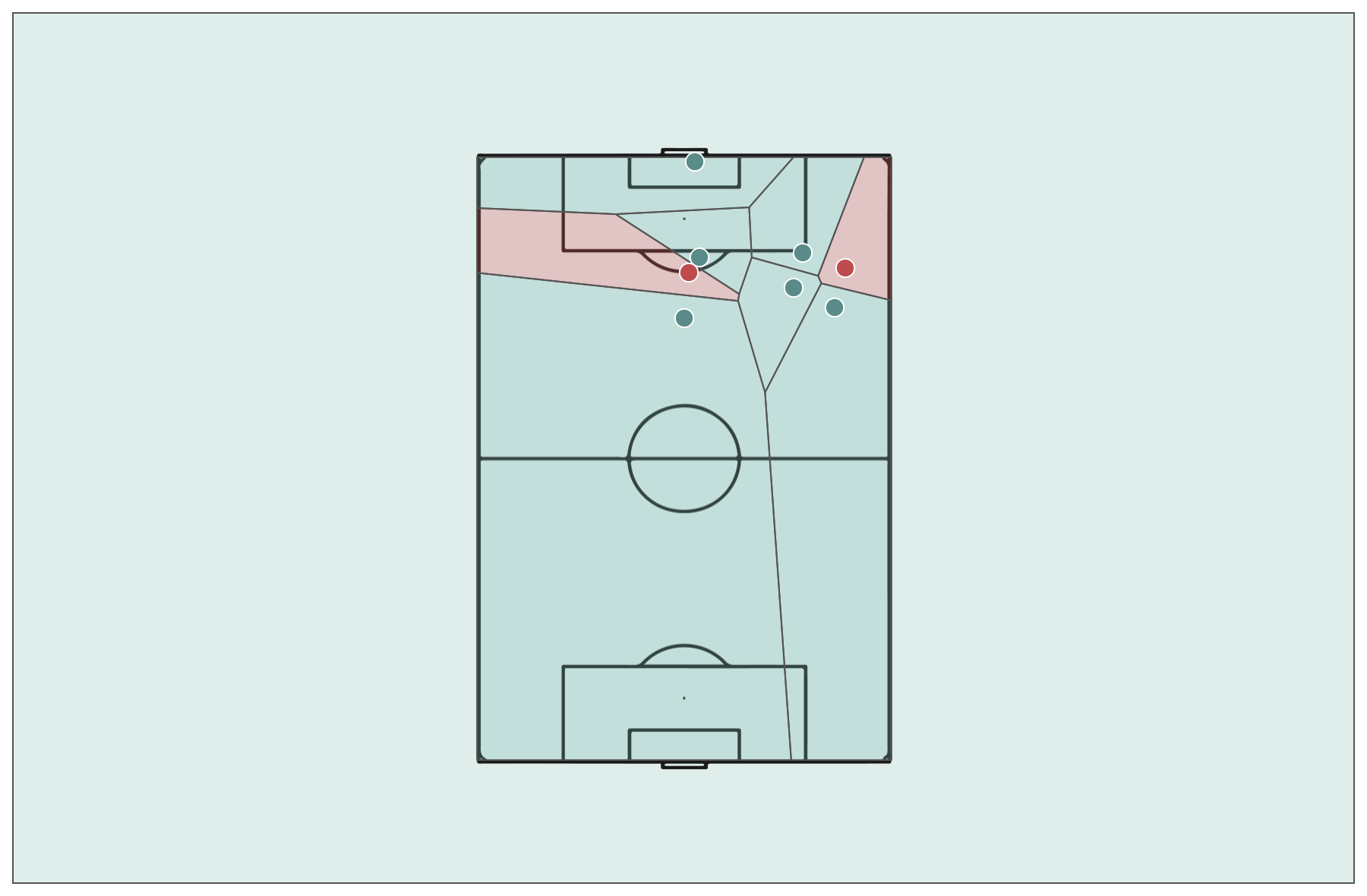 The Voronoi diagram is useful as it can be used to take a freeze frame of a match for example at the time a shot is taken, to present the space around each player. The border will therefore reflect the mid-point between one player and another player around them. There have been some really cool video analysis of showing this during a game.