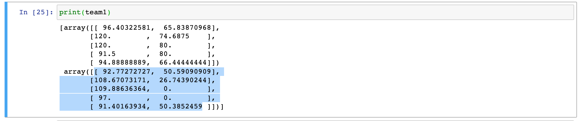 So to find the different polygon (voronoi shapes) for each team we will want to print team1 and team2 out in the console. You will see that they are captured in arrays.