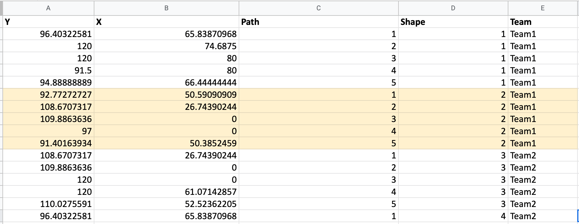 So now we know each block/shape is made up of co-ordinates that are joined up in an order using a path. But then we must include an ID for each block/shape, because otherwise Tableau will not know that they are their own distinct shape and will try aggregating the values. This is why you will see a shape column. The final column I have added is Team which will be used within the calculations as well as for colour!