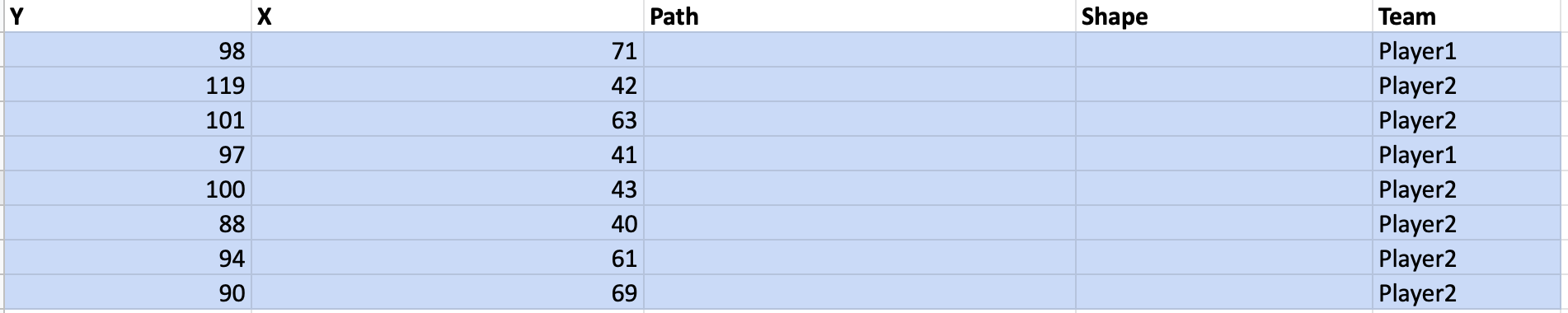 You will see these appended at the bottom of the dataset. These values come from the sample code again, but this time are the x and y values of the player positions, not the voronoi shape! Again, they are currently stored in an array.