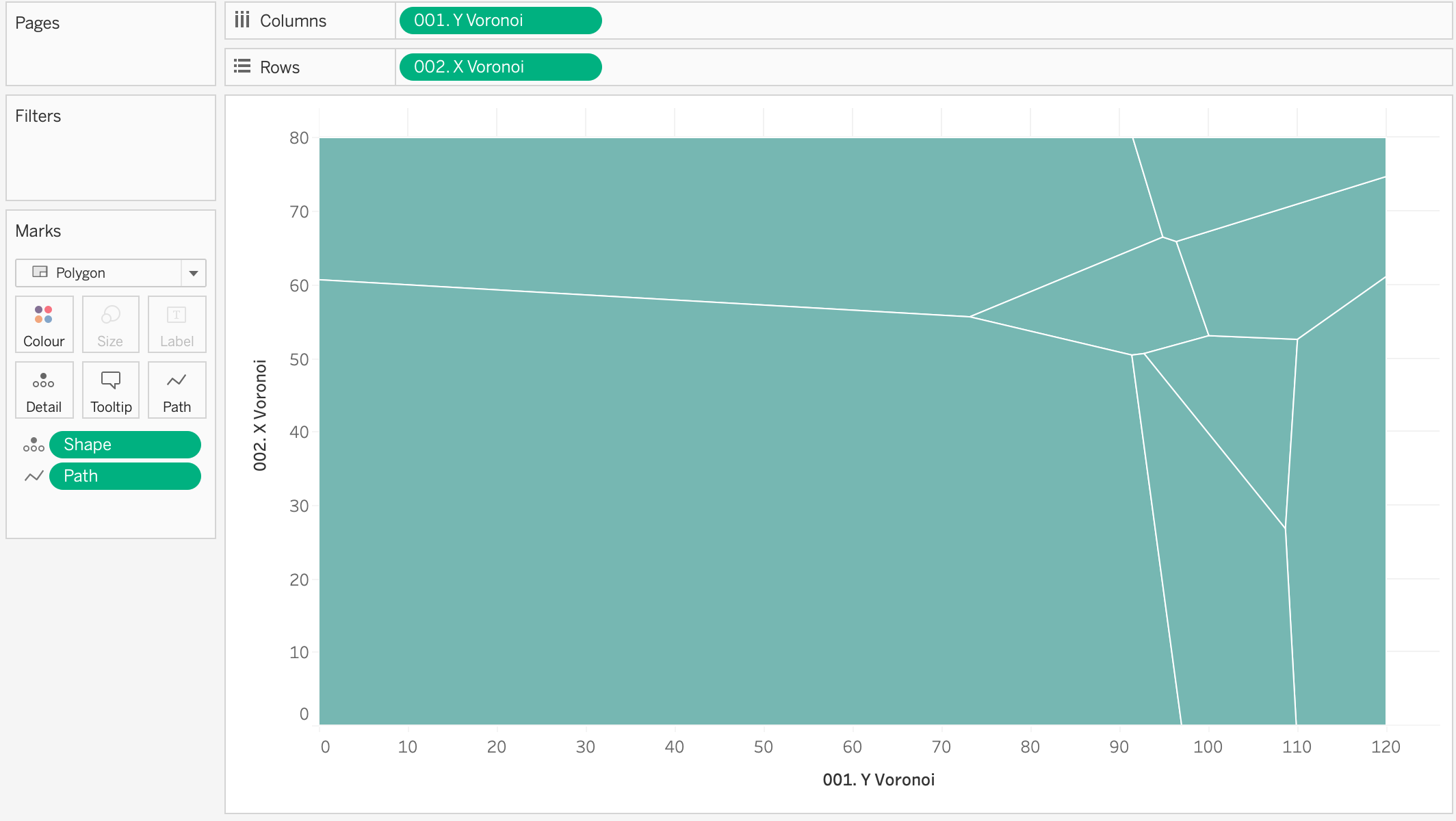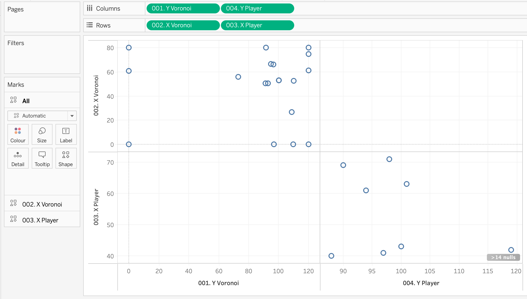 I would recommend building your voronoi and players charts separately before trying to merge them together in a dual axis, as it will help with troubleshooting.