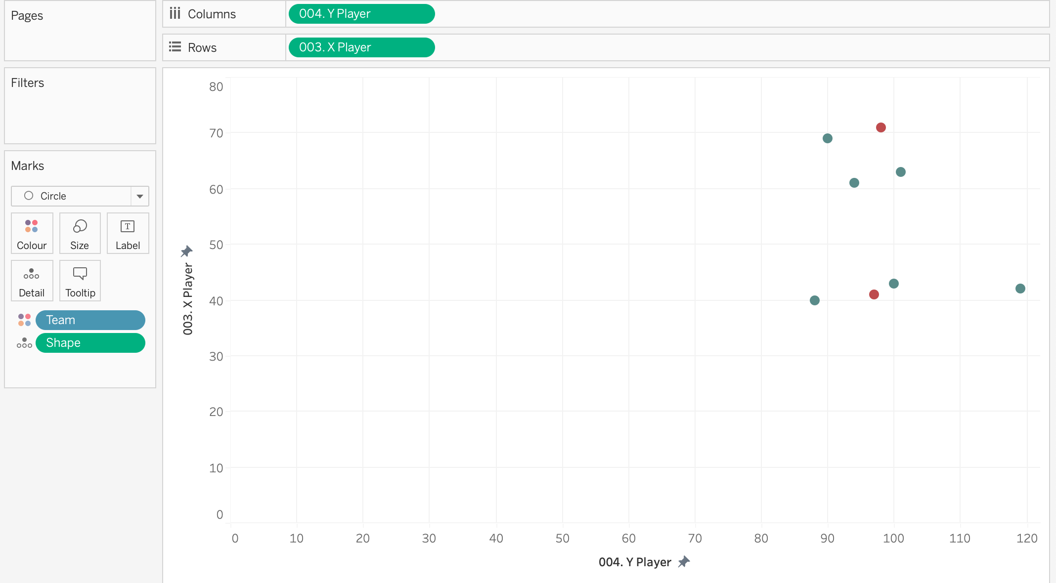 Add X and Y onto detail and team onto colour. Make sure the marks is a circle. These are our player points.