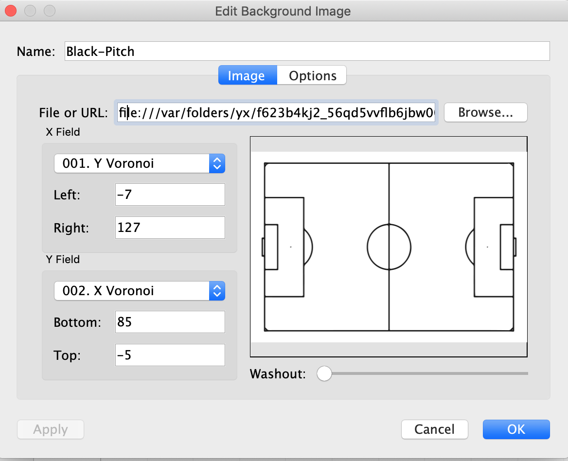 One REALLY important thing i've noticed is when using dual axis, is when you want to add a pitch background you have to use the first metric that is seen in your column and row header! Otherwise the pitch will not appear. I.e in my case it was the voronoi x and voronoi y fields.