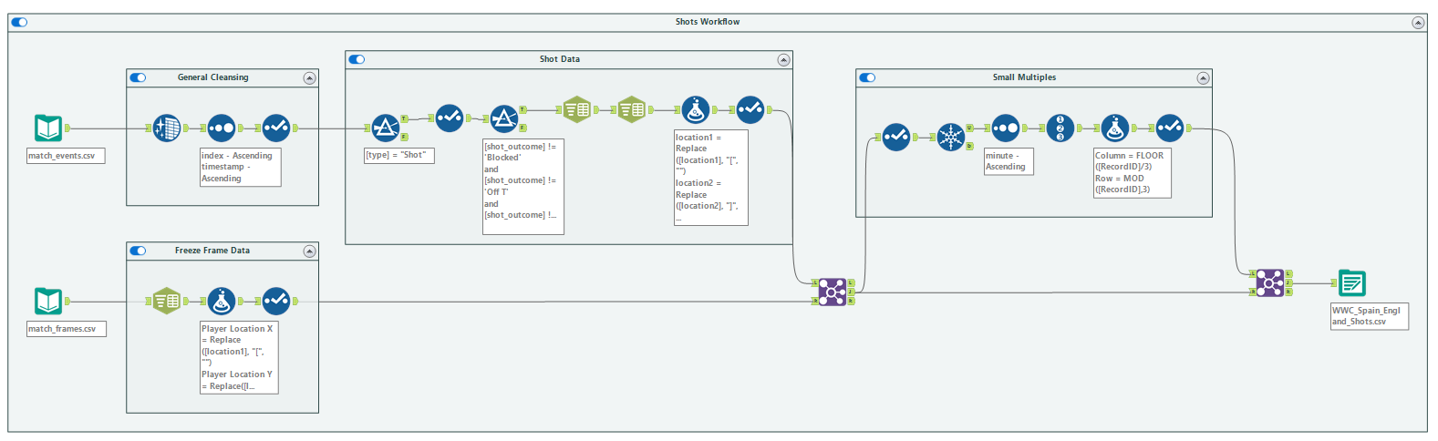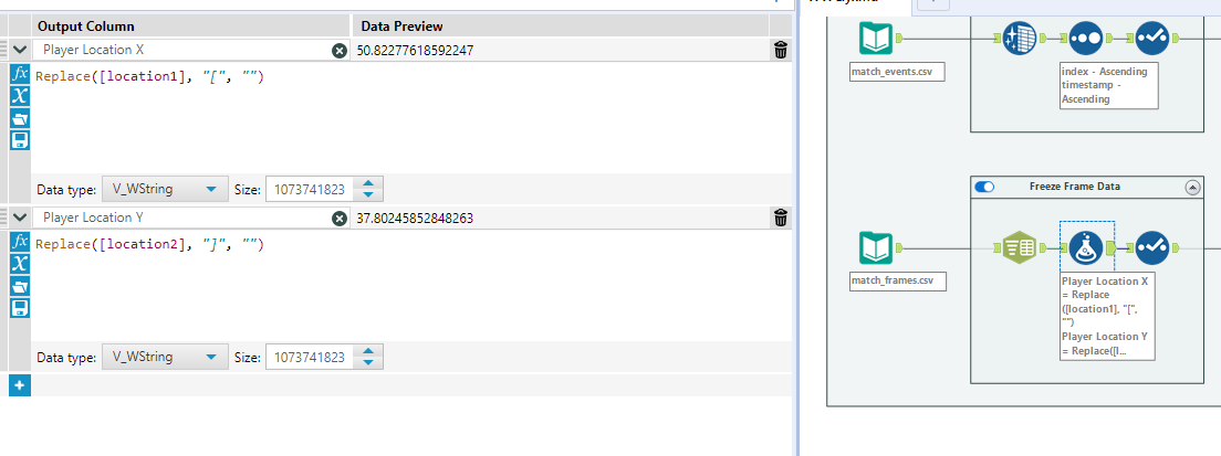 In a similar way to the shot location data, the only transformation here needed is a split to columns and formula tool to tidy up X and Y co-ordinates.