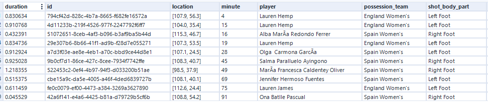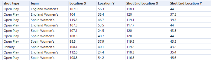The final dataset is what we will take into Tableau - It can be found in the repo as WWC_Spain_England_Shots.csv