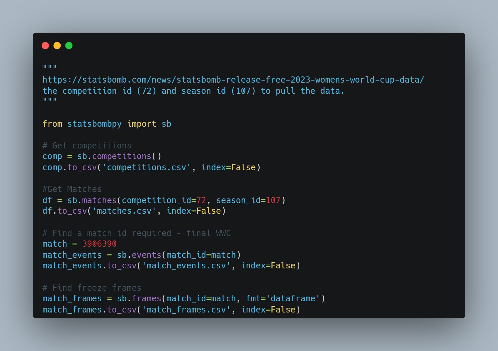 StatsBomb are kind enough to release data for free. The WWC was one example of this. To retrieve the data we will write a simple python script and export it to csv, but make no transformations to the data within the script.