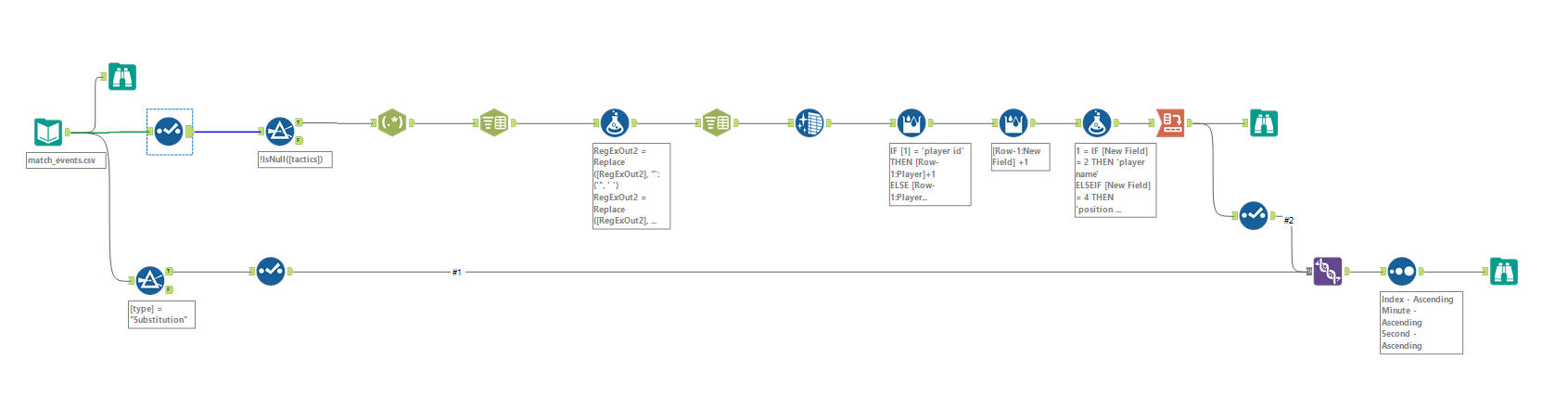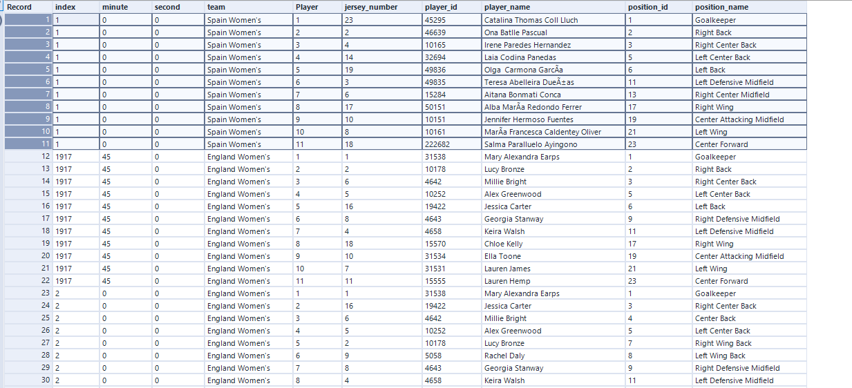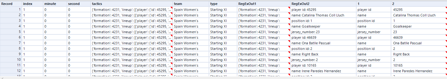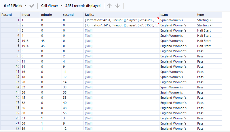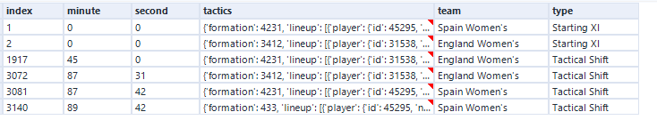 It is worth mentioning there is an easier way of pulling back some of the records, such as the line up and that is through python. You can find how to convert the json into a readable format on the mplsoccer website, it consists of the following line of code