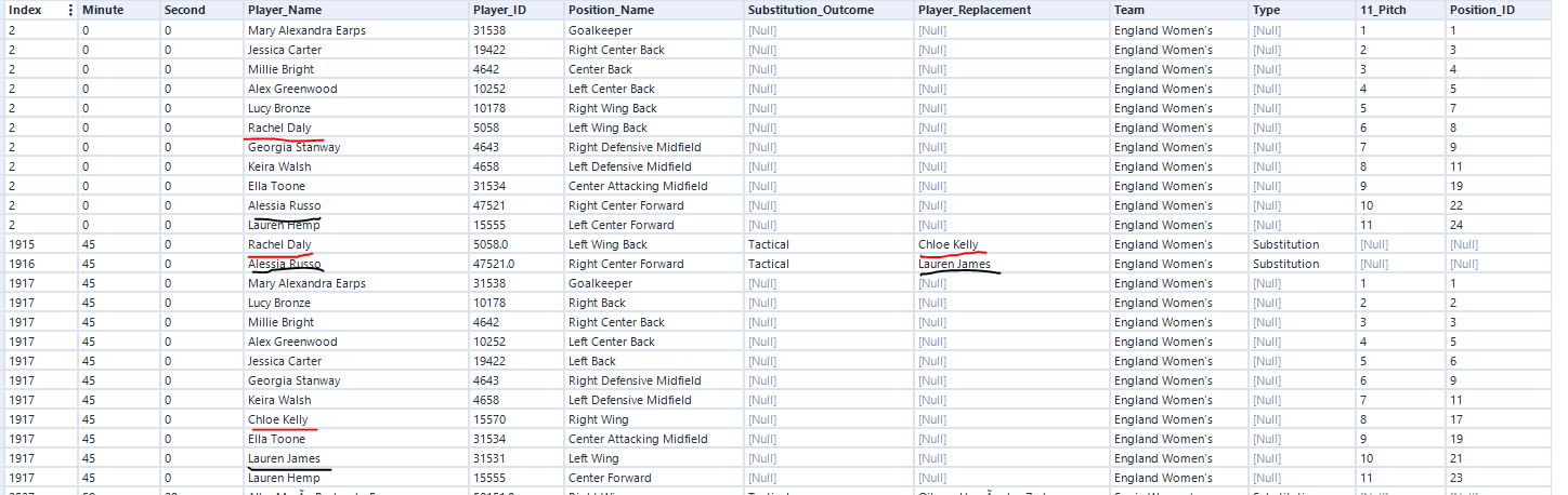 Take the above example, we see Chloe Kelly and Lauren James sub on at half time and the tactic / line up change and we log both those events in our final dataset.