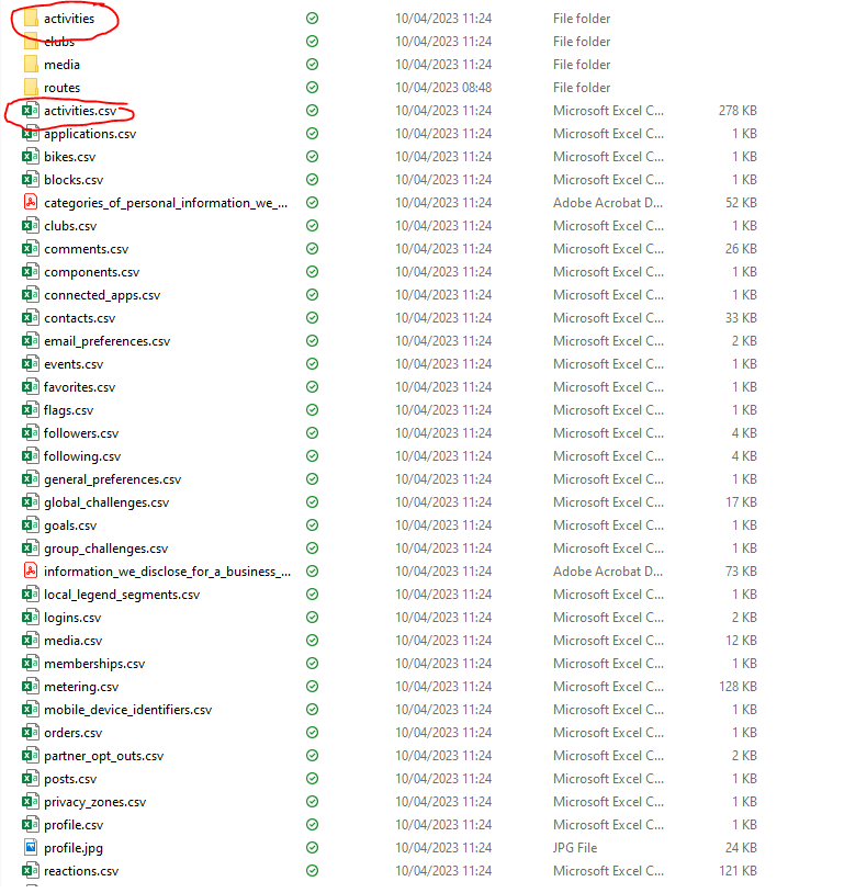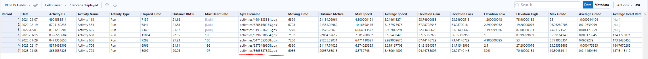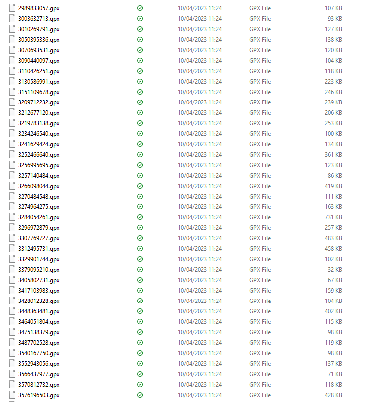 So here is some example gpx files that are associated to my account. Of course we will have some common fields to be able to join these together for example the date of the event as well as the activity ID of the gpx files.