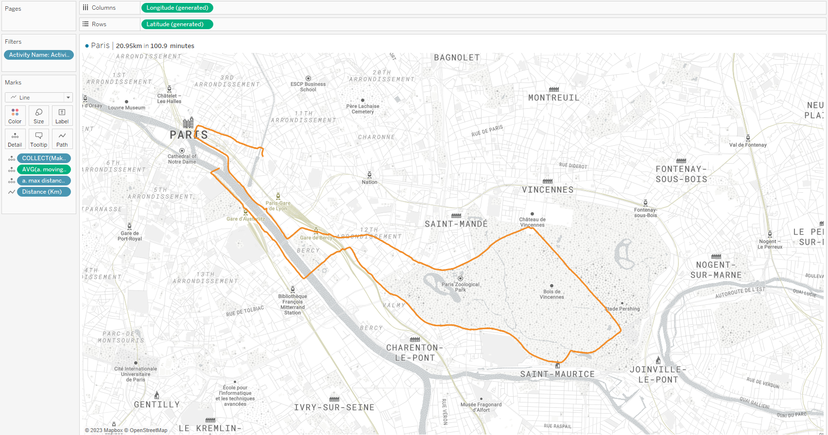 To create the map, I like to use the lat and long co-ordinates from the exported version of the gpx data that is now a text file - I added a few extra calculations for the view to be able to see the distance travelled and total time taken.