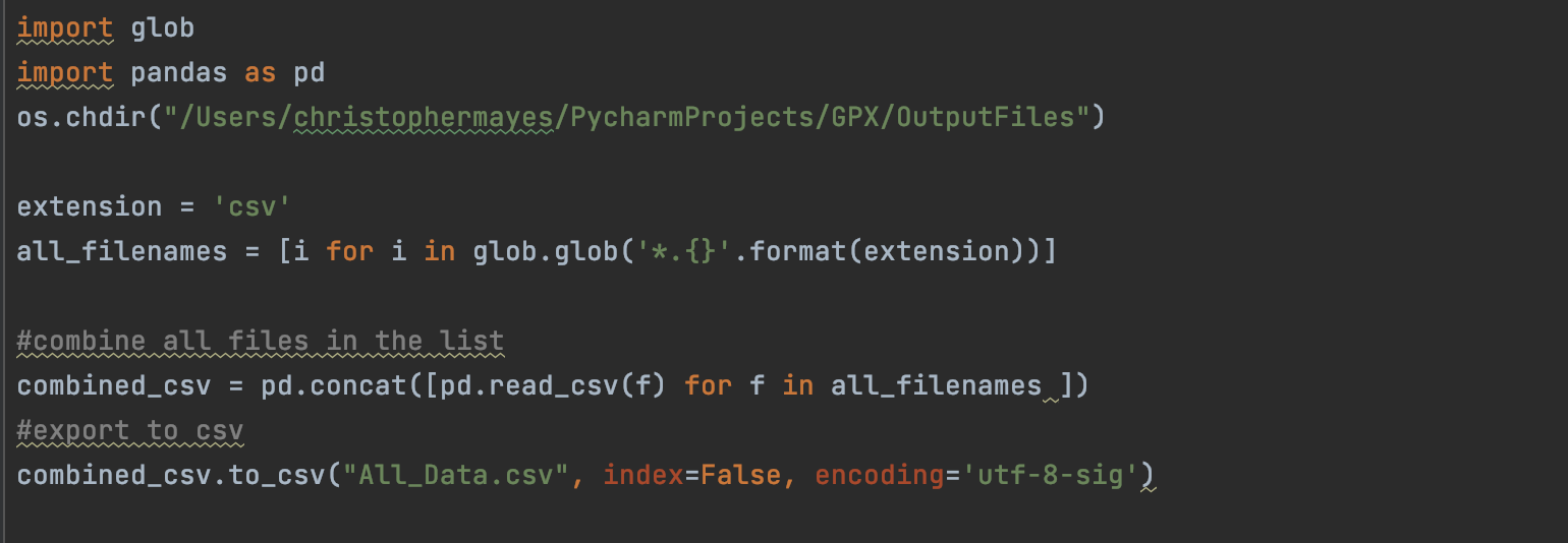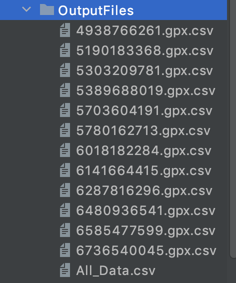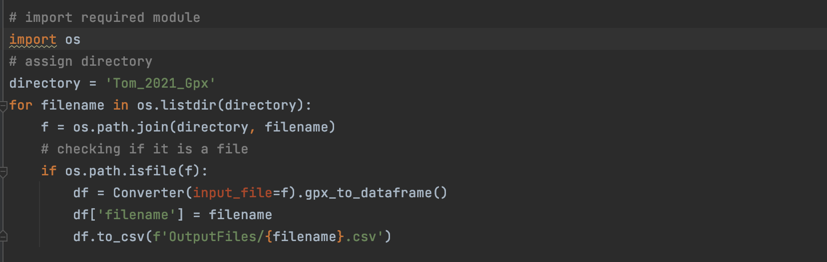 This code snippet will convert the gpx file to a dataframe and add a column with the name of the gpx file. It will then save these files down to a chosen location as csvs, In this example I save them to a folder I created called OutputFiles. This means you will have a csv for each activity.