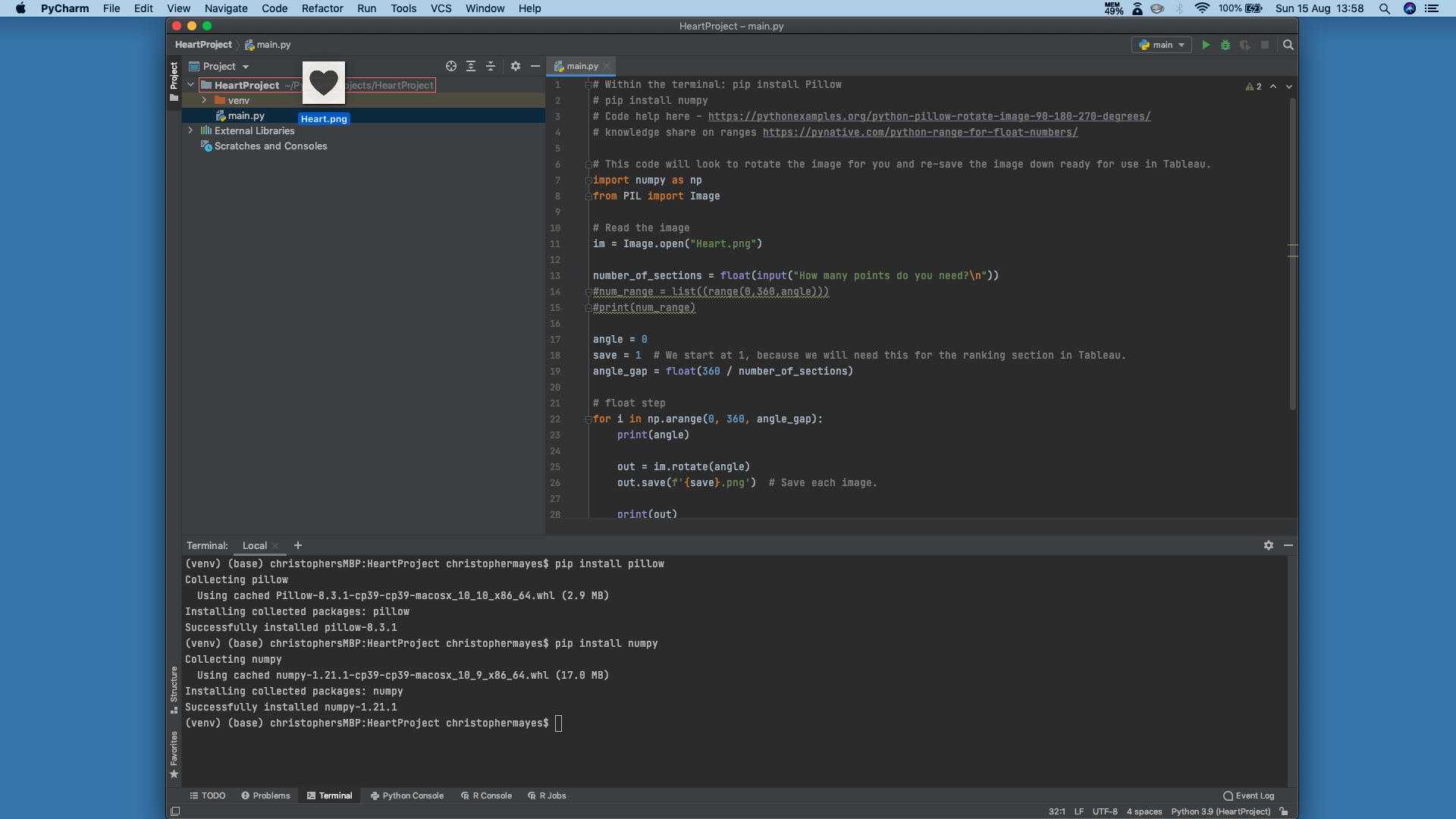 Within the terminal, run the commands 'pip install pillow' and 'pip install numpy'. These are the two packages we will require. You can find the documentation here, and here, respectively.