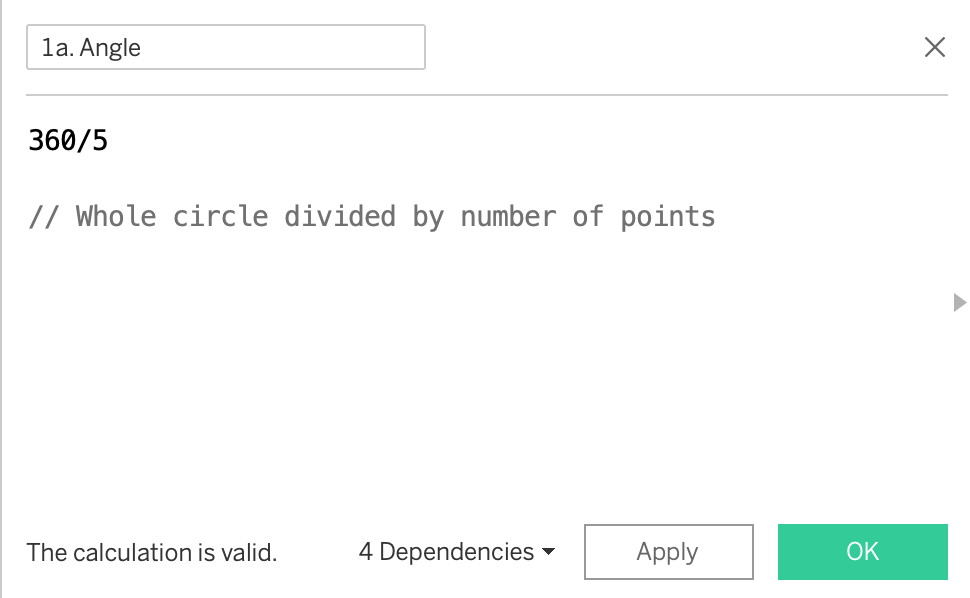 Angle - Create the angle between each circle. This will be a constant, given we want equal spacing between each point. 360 degrees divided by the number of points you have, in this case 5.