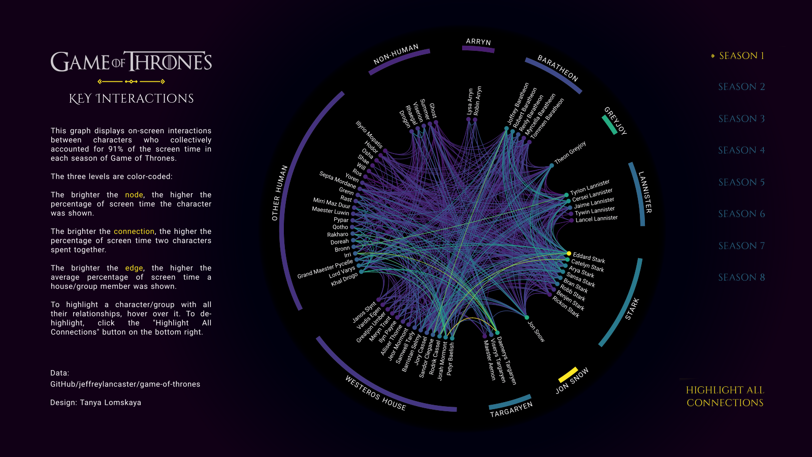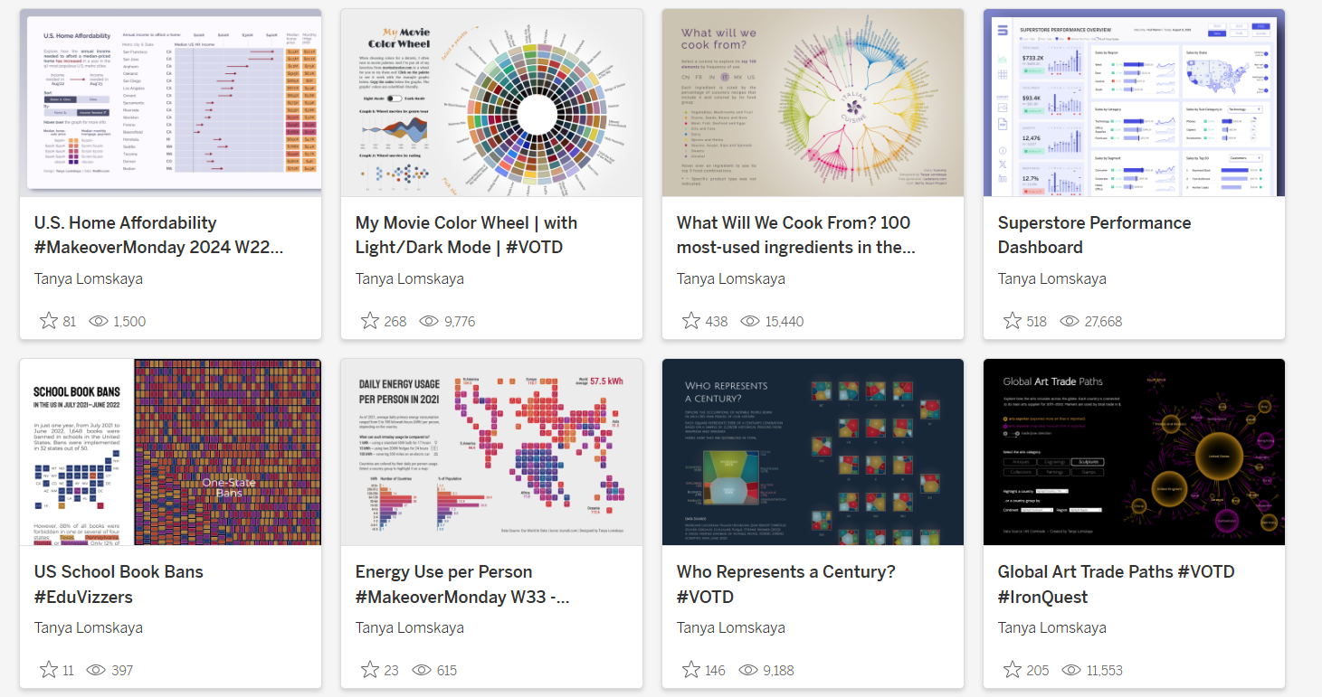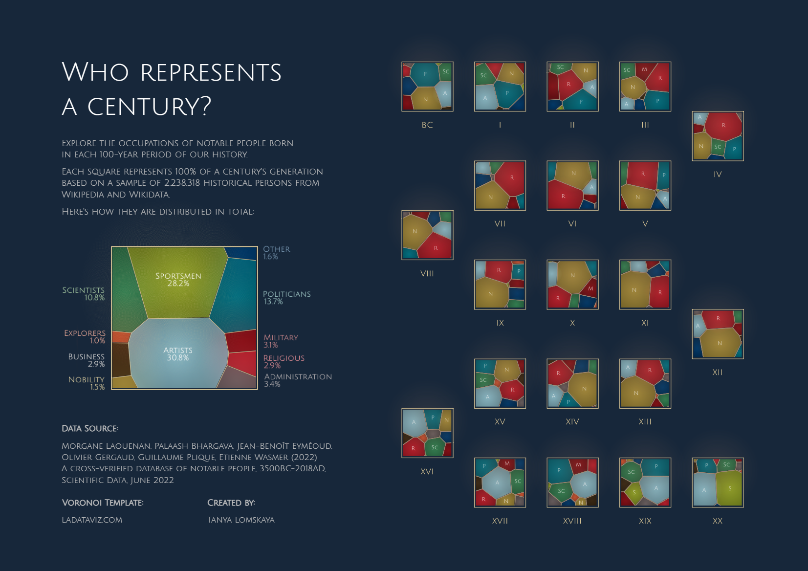 > PillowIf you're not yet a coder, my go-to is to become one.(Just kidding.)(Or not.)I also always recommend studying Inkscape, an open-source Figma-like package, but more oriented towards visual design. The most basic thing you can do with it is to extract the SVG file with labels fromLadataviz.com, change their colour, font, and size, and then upload the resulting image to Tableau as a background for your chart. You can do a variety of more advanced text tricks, generate visual effects for your background and navigation elements, and create the most intricate shapes—there are plenty of tutorials on this topic on YouTube.CJ: You’ve done some work on dashboard design using other tools and technology, like your precious metals piece. You reference some places to help you get started with Dribble, Dash, Plotly and stackoverflow. With advances in AI and prompts, what build aspects will become easier?T: This will change the whole process of creating apps. I tried creating an app in Plotly Studio, which is currently in beta testing; the experience reminded me of working with Midjourney. You don't need to know coding at all.It feels like dashboard/app creation is changing its nature. Instead of developing from scratch, we will improve in interacting with AI, while our technical skills will drift towards revising and correcting AI creations.CJ: Chord charts are not easy! Your visualization on GoT covers all 8 seasons with colour-coded indicators - what design challenges did you face in representing such an extensive timeline in a single visualization while maintaining clarity about how character interactions evolved over time?T: 90 percent of the entire creative process in this case happened outside of Tableau. I calculated the coordinates for all three layers of the chord—nodes, links, and edge polygons—using Python. (By the way, I learned to build all these elements in Python thanks to a cool tutorial on radial bar charts from the Flerlage twins: I simply replaced the Excel functions from their step-by-step manual with Python ones and began to calculate the coordinates for all my radial graphs.)I created all the labels for the chord usingLadataviz.com and Inkscape. Then I turned to Tableau to connect it all, attach the necessary backgrounds to the necessary graphs, and set up navigation between the elements. The final design is simple: in addition to the chord itself, there are toggle buttons for switching between seasons and instructions on how to use the graph.The main challenge here was the amount of preliminary work: developing the code and generating multiple background images.CJ: Your circular or chord visuals “Who's In The Spotlight?”, “My Movie Color Wheel” & “What Will We Cook From?” are all the centre focus of the visual. Is this a conscious decision? How do you weigh up what other charts or text to align on the page so as to not detract from the main visual.T: Everything that goes beyond the circle is perceived as the periphery—hence this design. Almost all important information is contained within the circle, and everything outside is either legends, navigation elements, or auxiliary charts. This approach seems very common; I have seen many authors utilizing it. Whenever I create a radial, I place it exactly like this.CJ: What has been your favourite visual to make and why?T: If you mean which of my visualizations left the most positive emotions while developing, it's "Who Represents a Century." It was a purely creative process from start to finish, more like a game, based on a very interesting dataset. All the way I was focused on the visual part and creating a certain perception that I needed. And the cherry on the cake is how warmly the result was welcomed by the community.CJ: What guided your decision to use Voronoi diagrams to represent occupational distributions rather than more conventional charts, and how does this visual approach enhance the storytelling about historical representation?T: It was done more on a whim, but here's how I explain the idea. Sciences Po cleaned up and systematized Wikipedia data on people of different professions who lived in different eras, up to the present day. But Wikipedia is not an objective source of knowledge about the inhabitants of a particular time. It contains information only about those people who, for some reason, remained in the memory of mankind.In other words, this data is about our perception or fantasy about the past, not about the objective truth. Thus, the idea was to simultaneously show you each century's proportions and somehow make you doubt them.Voronoi came in perfect for this. Apart from the stated effect, this graph resembles a mosaic or stained glass, which is strongly associated with history, or abstract art, which completely appeals to our subjective perception. To enhance this impression, I gave the graphs the appearance of an art gallery.CJ: In the wider data visualisation community, are there any portfolios of work that have really inspired your journey, or made you think “wow I’d like to make something like that!”?T: There are actually a lot of people about whose work or entire portfolios I think, “Wow.” Let me list only those who have significantly influenced the creation of the visualizations already published in my portfolio. These are the Flerlage twins, Andy Kriebel, Chimdi Nwosu, Priya Padham, Pradeep Kumar G, Kevin Wee, Dennis Kao, Wendy Shijia, Klaus Schulte, Will Sutton, and Damola Ladipo.CJ: Are you working on any exciting personal projects?T: I have been wanting to start making maps for a long time now, as I am incredibly inspired by the work of Dennis Kao, Nir Smilga, Naresh Suglani, and George Koursaros. Next, I want to continue the theme of representation of people in history, but this time focusing exclusively on women. I am curious what the data will show. And at some point in the future, I would like to do a project dedicated to my home country, Belarus.Have a gr