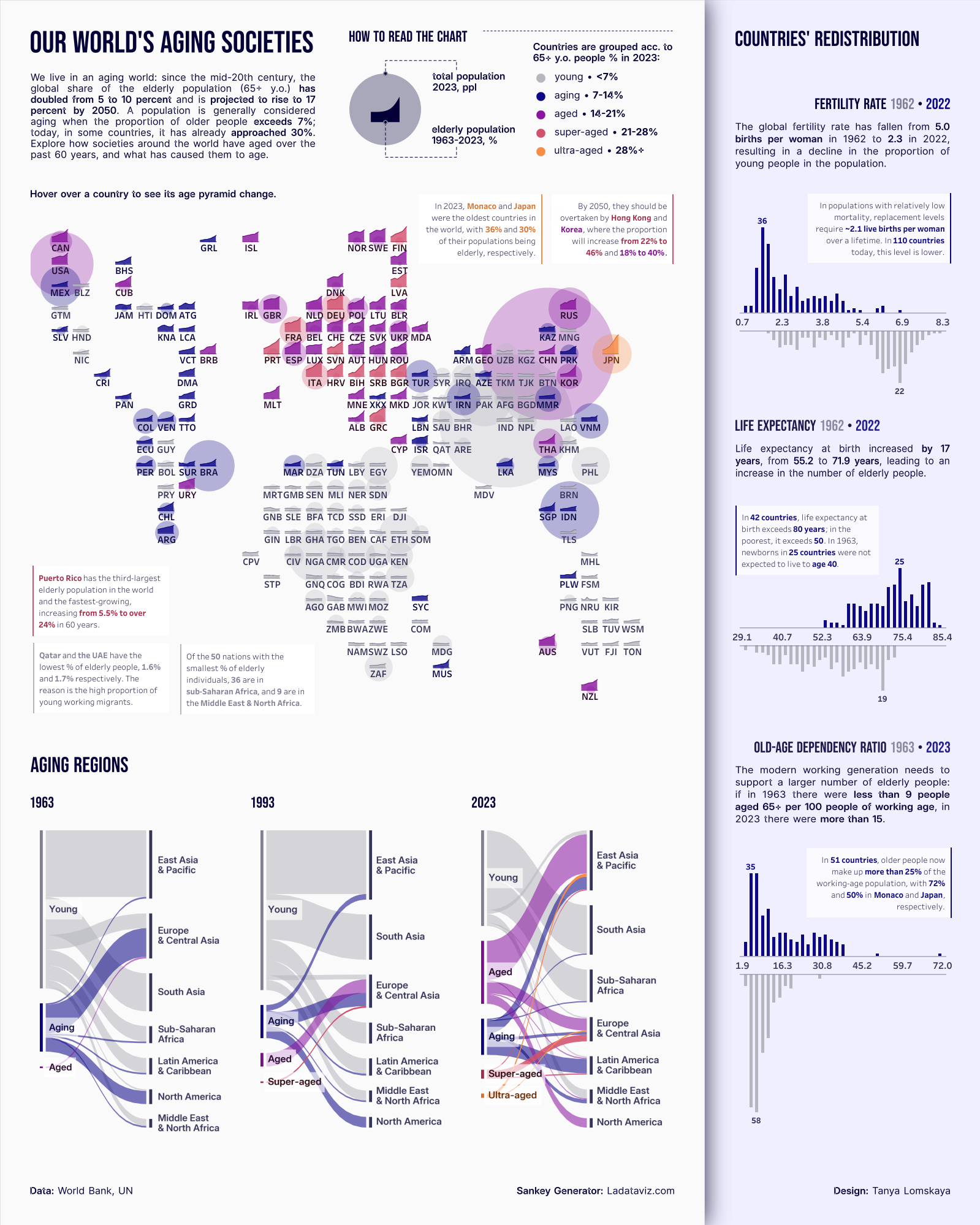 CJ: Tanya, thank you for giving up time to share more on your portfolio of work. What was your entry point into the world of data? Did your background in Economics and finance push you this way? T: It is difficult for me to pinpoint a specific entry point. I received a degree in sociology but didn’t pursue a career in it. I dreamed of becoming a journalist, and so after graduating from university in Minsk, I went to Moscow to make my dream come true. I became a journalist and spent eight years in large business publications, writing first about stock and insurance markets, then about macroeconomics, central bank and budget policy.Business journalists who write for print can be divided into two types. The first are focused on establishing and maintaining relationships with sources—officials and top managers of companies—who leak information to them from time to time. The second work more with open data: they track business indicators and government statistics and interact with analysts and scientists. I belonged to the second type.If you want some parallel with the work of an analyst, then my first job was to identify outliers—events and indicators that stand out from the general trend—and try to understand why they happened, whether there had been some significant social or business event behind them. Such a statistical anomaly could turn out to be an unnoticed consequence of government cover-ups—in one case out of a hundred. In the remaining 99 cases, there is nothing worth nationwide reporting behind such outliers, and you spend tens of hours just to reapprove this simple truth.I obviously needed tools to speed up the processing of information so that we could check the newsworthiness of statistical events more quickly. I started learning Python and writing scripts to process government statistics, tax returns, and the like. It was quite fun, because some economists and researchers I was collaborating with also started coding at the time. It expanded their ability to do research so much, and there were some just phenomenal ideas there. I learned a lot from the people I was surrounded by at the time; they changed my view of working with data and generally my view of the world in many ways.CJ: You have a wonderful eye for design, that goes beyond just Tableau visuals and the technical proficiency needed to create such elegant pieces. For your more recent “Our Worlds Aging” visual, how do you go about planning a map piece with data “layers” of the area charts and circles. T: I borrowed the two-layer map model from Klaus Schulte's IronViz 2019 entry.I was hooked by the ability to display the indicator as both a current static value (the area of the underlying circle) and a historical trend (the height of the overlaying bars), and all this with a geographic breakdown.I decided to apply his approach to visualizing the aging of the world's population, with a slight twist. While the polygons show the dynamics of elderly population share since 1963, the resulting percentage is expressed not by the size but by the colour of the underlying circle, while its size represents the total population in the last year of observation. This allows us to see, for example, not just the significant current share of elderly people in China, but also how much China contributes to the global picture of aging, given its huge population.I also added annotations to bring the demographic information to life and set context for the whole narrative.CJ: From a technical aspect, I love that you’re willing to share more complex charts in Tableau. Going beyond your medium blog on graphviz, are there any other charts that you’d like to replicate in the future? How do you go about planning non-standard chart types design?T: I think that the need for a non-standard chart design mostly arises when you want to depict some complex phenomenon as a whole, without breaking it down into separate indicators. So initially, the audience sees just one graph, which, upon closer inspection, breaks down into many details.Take, for example, the timeline in the form of a curved area bump chart like this one from Robert Janezic. First, you see the timeline as a whole, along with a couple of genres that finished most popular; then you change the lens and see the path of each genre individually. Then you focus on half-decade percentage distributions; finally, you dig into the story behind the annotations. I tried to create something similar, but so far nothing worthy has come out.Also, I'd really like to find a way to create Dorling cartograms like this one from IIBA-2016, but in TableauThis seems like a really challenging idea, because other than the one mentioned above, I've seen maybe one or two visualizations of this type that actually looked good and not just like unintegrated bubbles. So far, the best attempt in Tableau was by Raisa Hannus; you wrote about it last year.Besides these, I'm fond of recursive Voronoi generative arts, like this fractal made with D3.js. I’ve written Python code to generate this kind of graph for Tableau but have not yet found a topic to use it on.CJ: Often for tableau visuals now in public, a whole range of tools get used to create them both for inspiration, data prep and design. Do you have a few “go-to’s” you can share that might help others elevate their own visuals?T: If you love creative visualizations, then your path in any case lies in the direction of D3.js or Python. For Pythonists, I can advise paying attention to the Shapely library for generating and transforming polygons, SciPy BPoly for generating curves, and PIL for image processing.