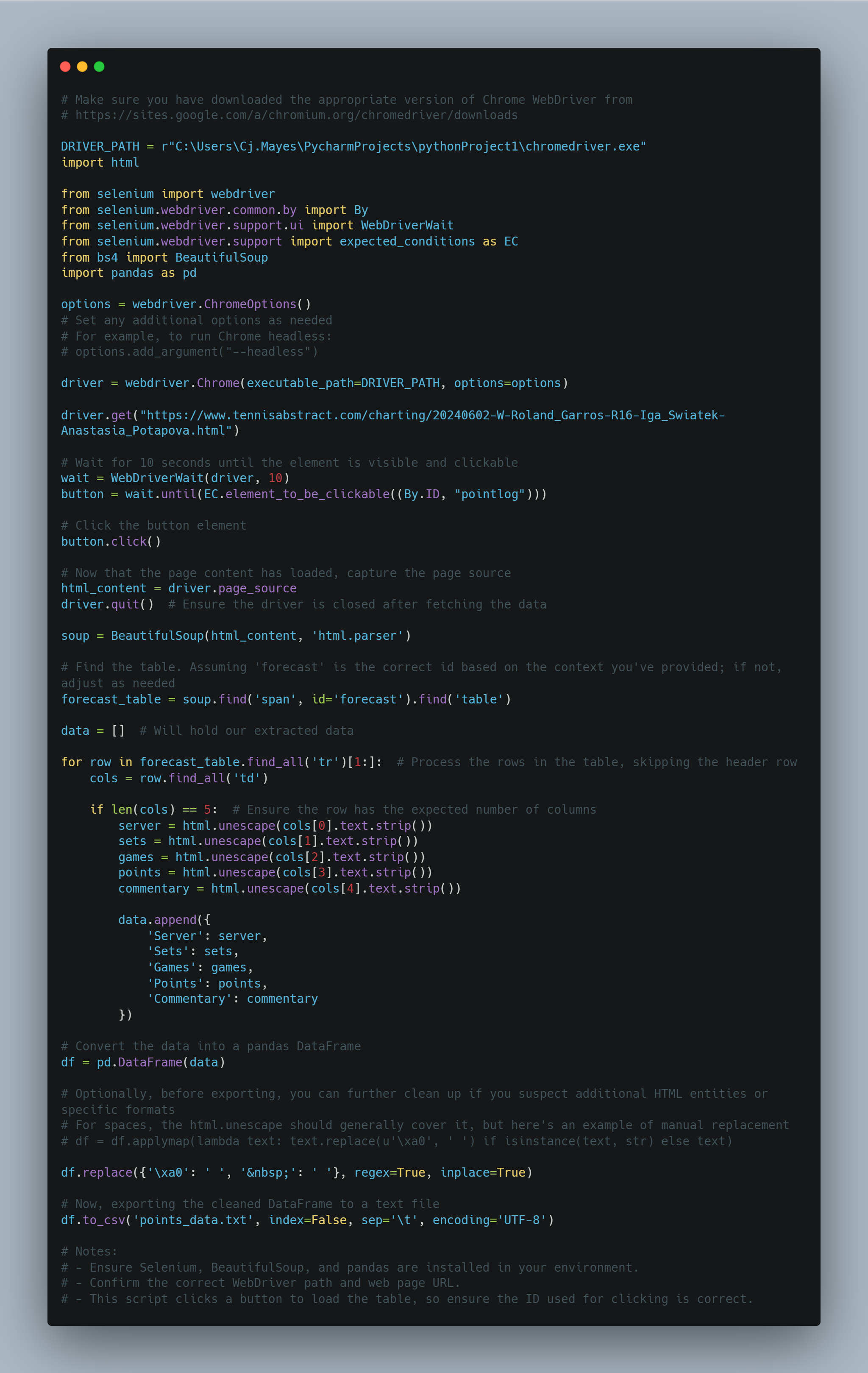 The code waits for a button element with the id "pointlog" to become clickable using WebDriverWait and the expected conditions. I put this step in because my chrome wasn't loading quick enough.