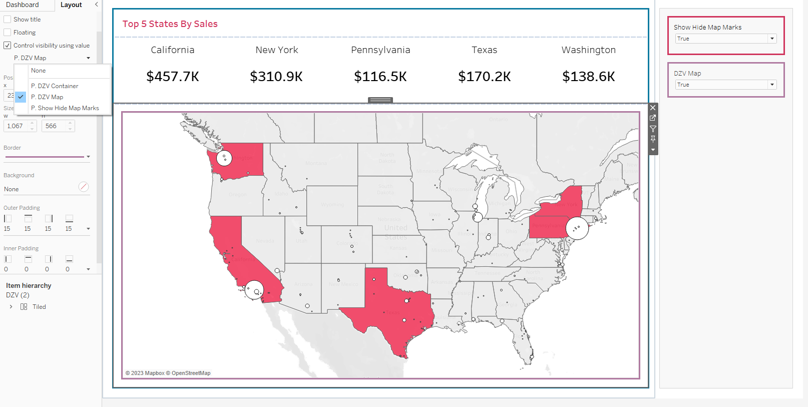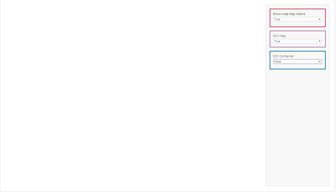 If we highlight the sheet and then go to layout, we can tick the control visibility using value and use our newly created DZV Map boolean.