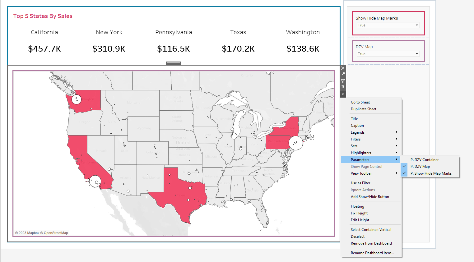 Add this parameter to our dashboard by clicking on our map sheet, going to parameter and clicking DZV Map.