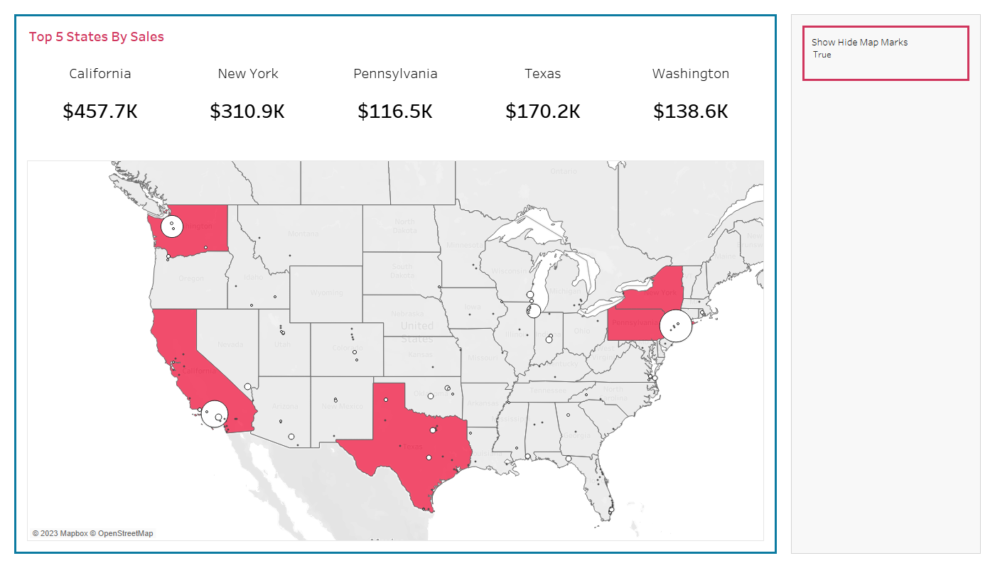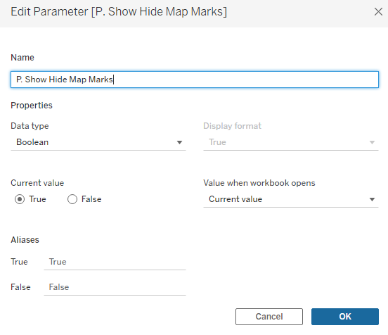 Click on the sheet, go to parameters and click our new parameter of Show Hide Map Marks. Now as you toggle between True (showing) and False (Hidden) The map marks from our layer will change between showing and hiding.