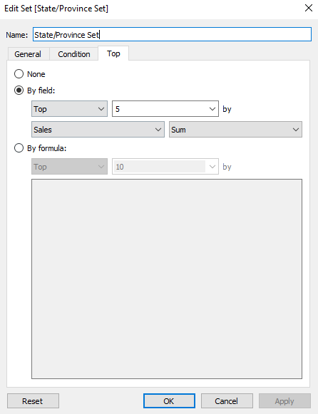 Off-piste, but now lets create a quick set from the state/province field called State/Province Set and select the top 5 sales field, using the sum aggregation. We will use this to colour the states that are shown in our BANs.