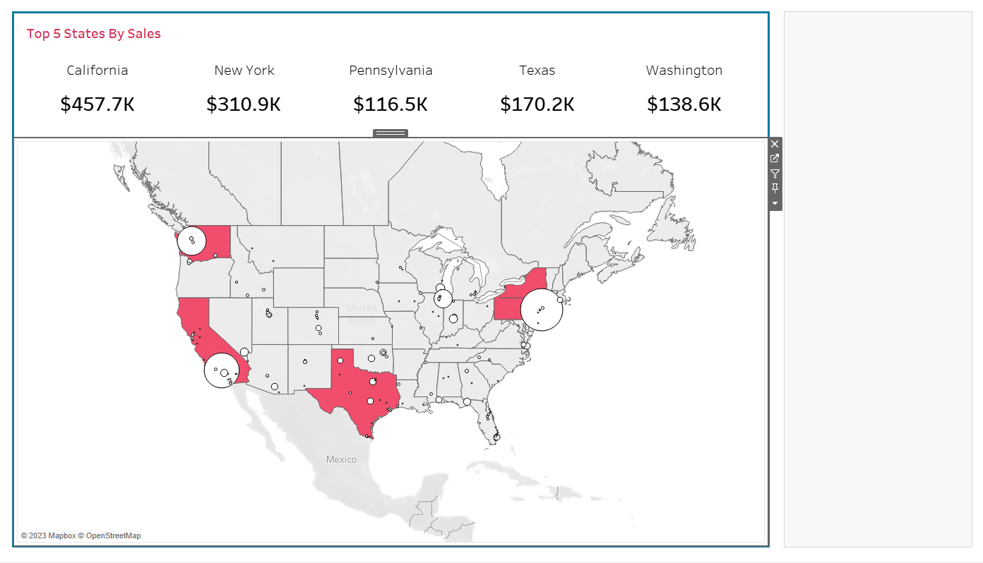 Add Sales to size and recolour in your choosing. Re adjust the map to fit the center of the screen, and then this is ready to add to our dashboard.