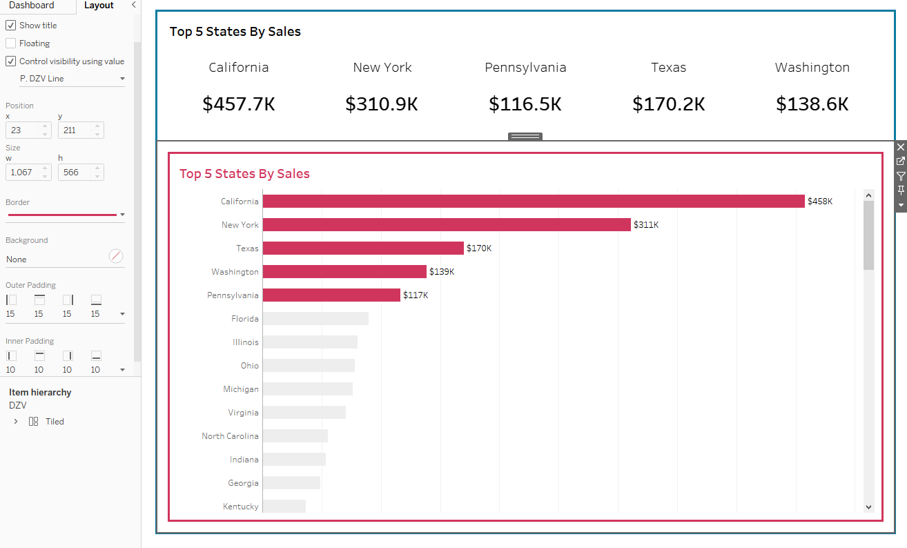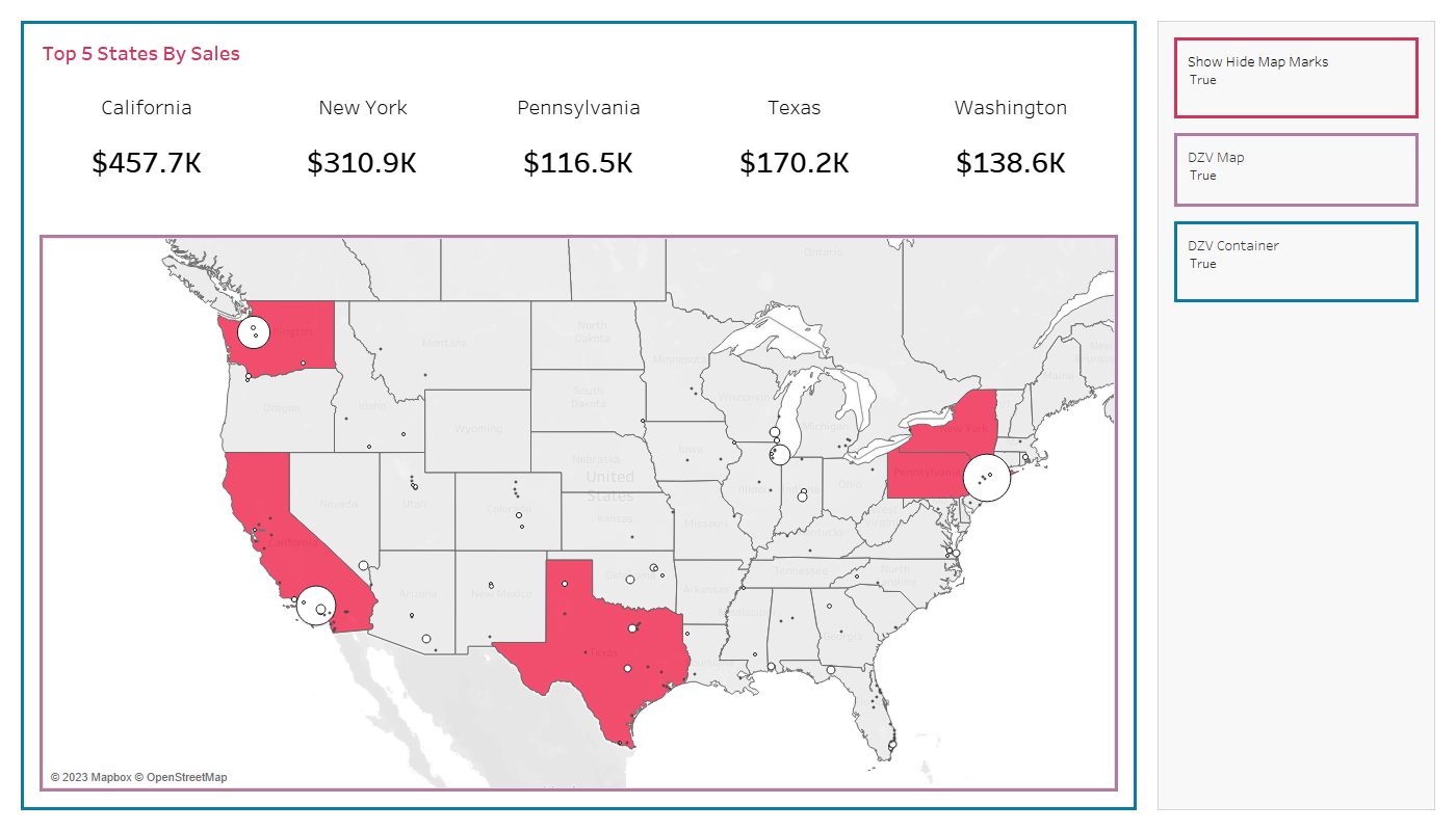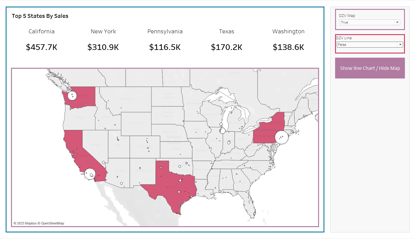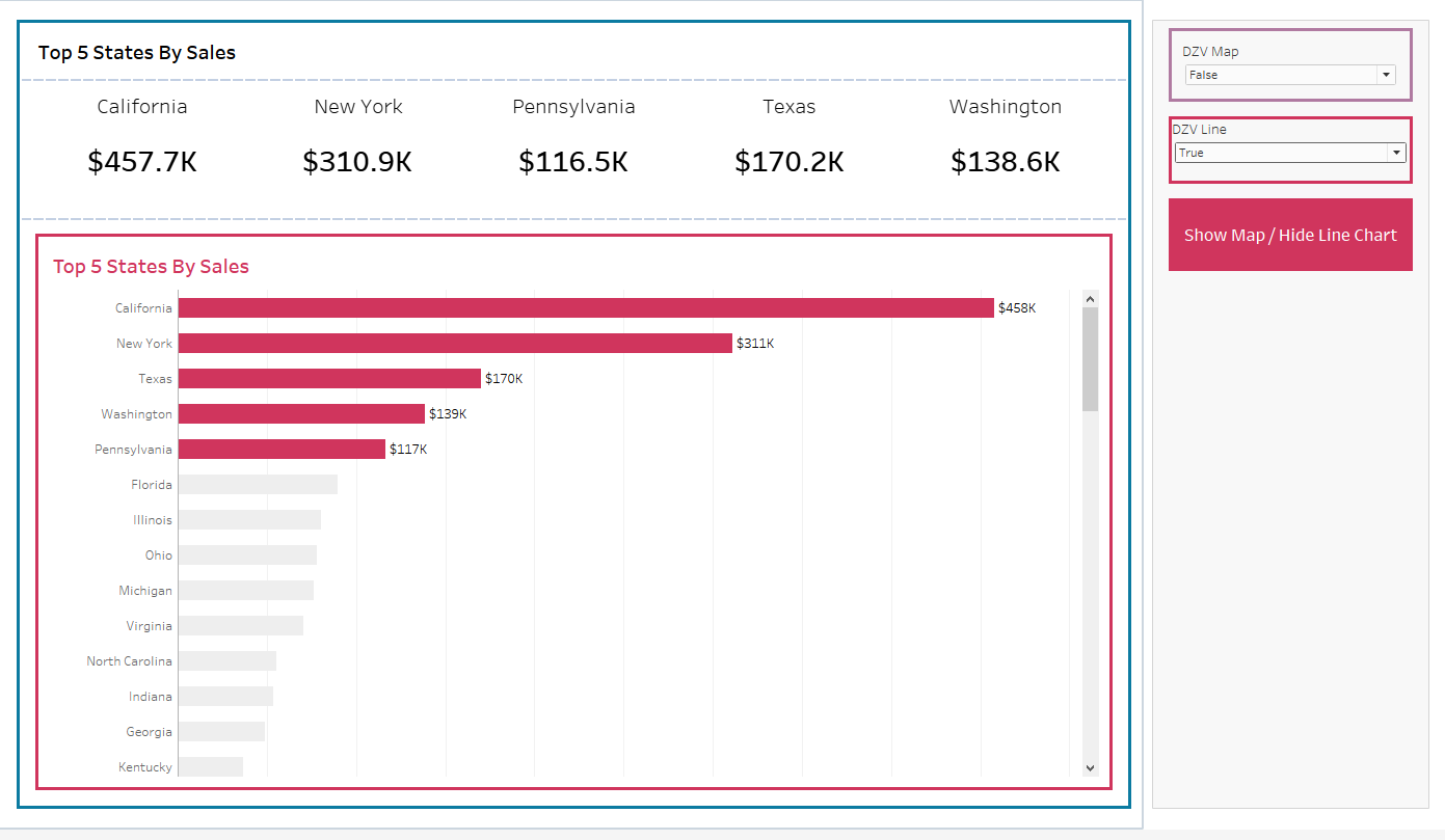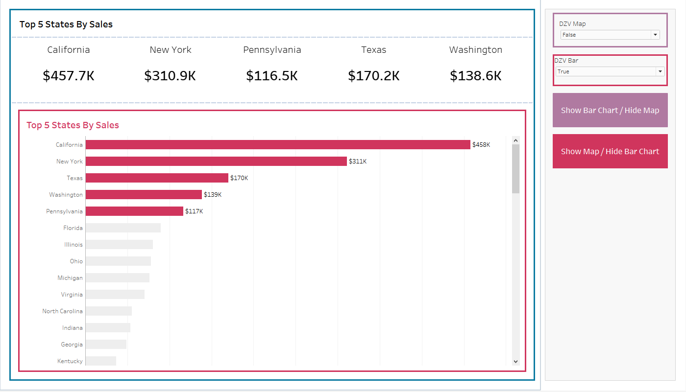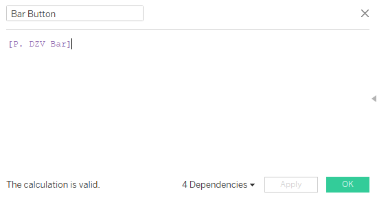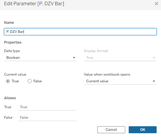 As a brief reminder of blog part one, we have a true false parameter that drives the dynamic zone visibility. We have one for the map, and we can create a new one for our bar chart in the workbook.