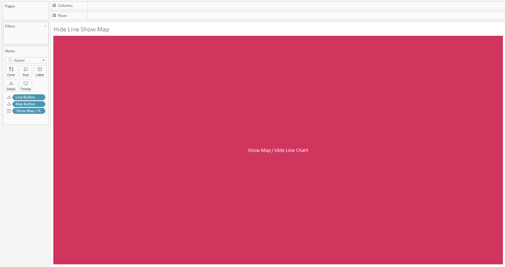 Lets create a fake button, go to new sheet, make the marks a square, add the text of hide bar chart / show map.