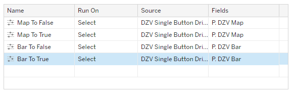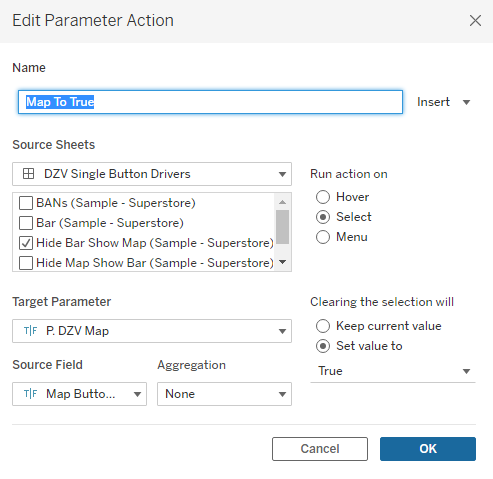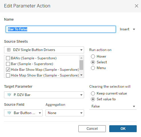 This action is the logical one - We are saying when we click our hide bar button, set the bar boolean parameter to false, source field, the field that contains our bar