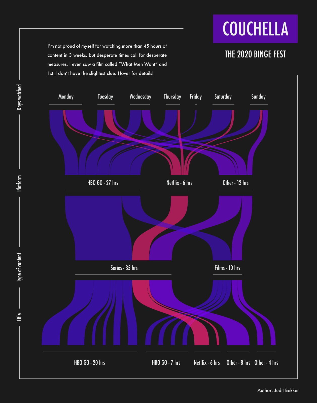 The name alone is genius enough, but it’s beautifully designed - as you can say for all of Judit’s work. I find dark colour schemes so hard to get right but this viz nails it, it looks like it could be a poster! The sankey style works really well for the subject at hand, and the border with the section labels is a really clever idea too.