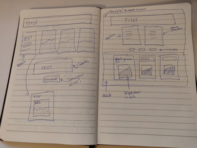 As mentioned in a previous question, I’ll start things off by brainstorming ideas on a piece of paper. Getting the trial and error of layouts out of the way early makes the actual design work a lot more efficient. In this case, I had three charts in Tableau I wanted to use, a title, two paragraphs of text, and a ‘donate’ button to build around. Here’s two of the less scribbly design ideas I had, with the one on the right pretty much being the structure I ended up using: