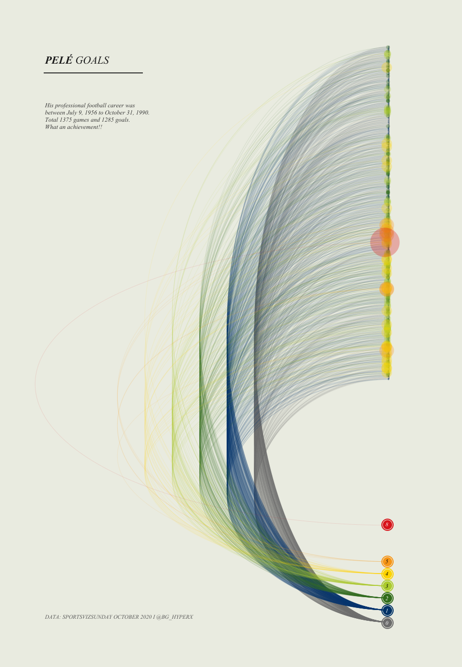 This ones an absolute work of art! Again, another viz that wouldn’t look out of place as a poster. It’s a really well-constructed, intricate, eye-catching design that brings Pele’s goalscoring record to life. The 8 goals in a game always makes me laugh, and rightly stands out from the other 1374 games he played in.