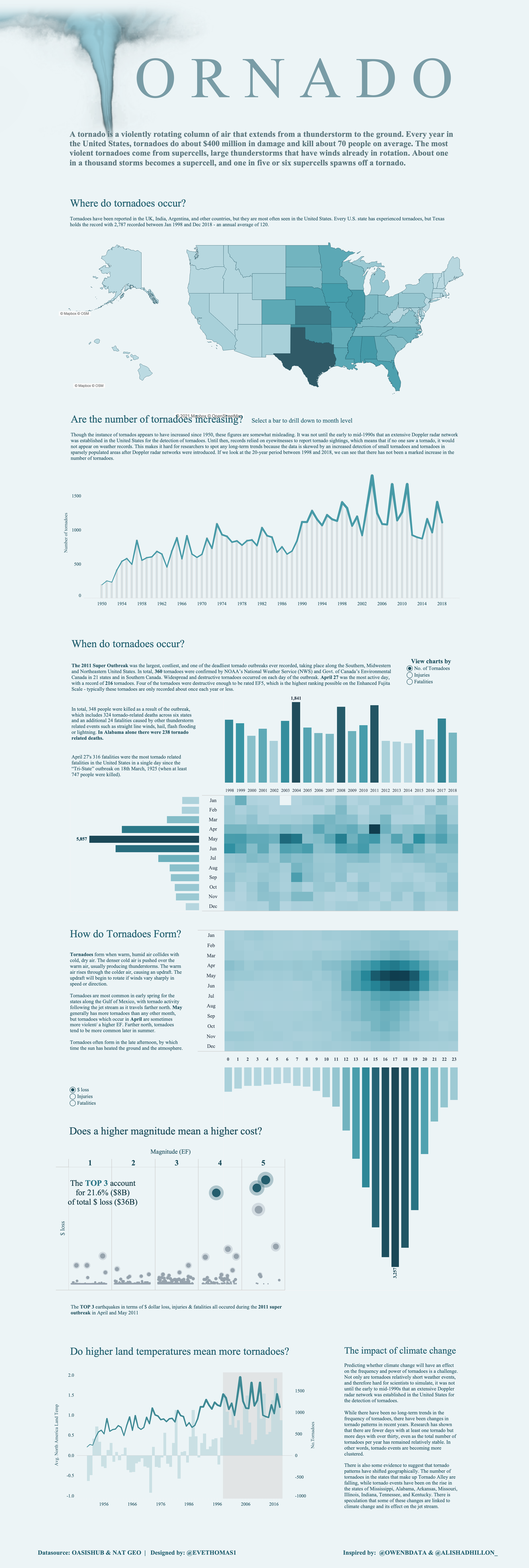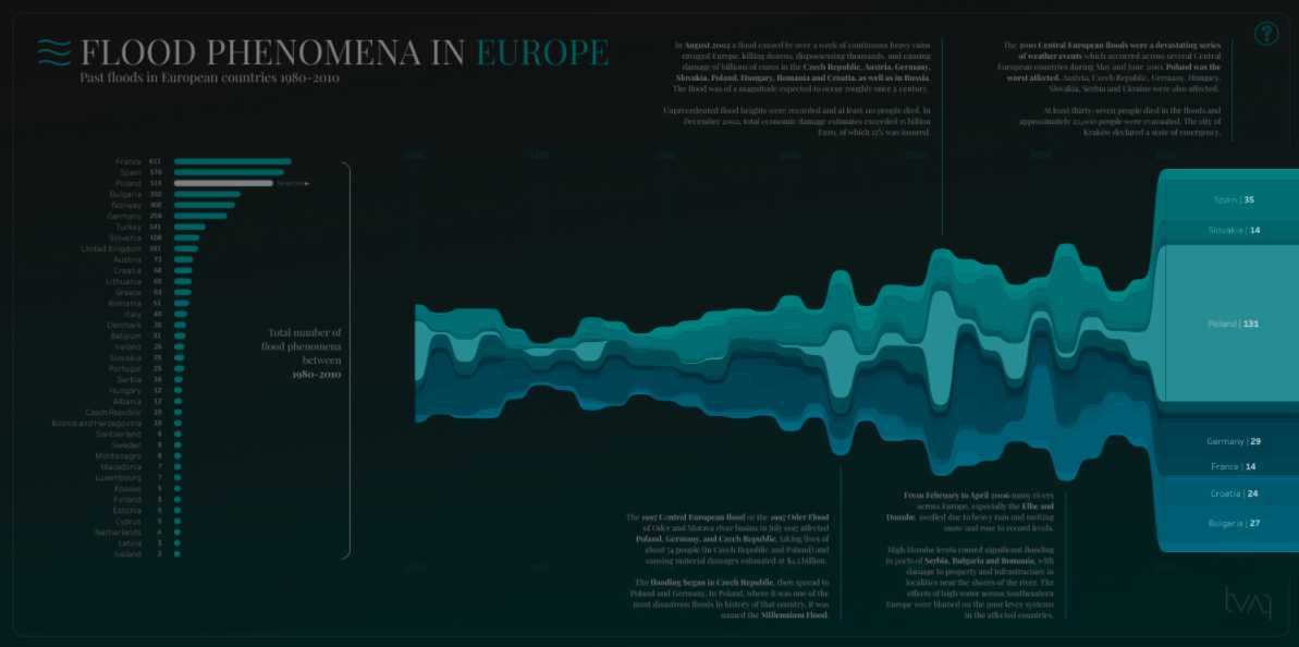 Tamas Varga is another source of inspiration that I just had to include in this list. His innovative, striking designs always leave me in awe. One of my favourites was his Flood Phenomena viz. I love how the use of a steam chart here mimics a river bursting it’s banks. Beautifully designed and beautifully executed.