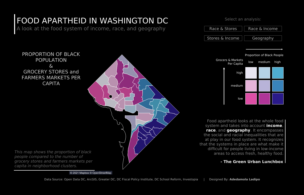 Damola Ladipo is another author whom I’ve only discovered in the last month or so. He’s already produced some incredible work. His Food Apartheid in Washington DC viz was nothing short of outstanding. Beautifully designed, it highlights how income, race, and geography impact social and racial inequalities in the DC food system. A WORK OF ART.