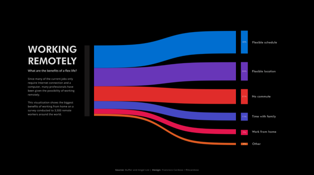 Francisco Cardoso’s is another inspiration within the community - his Working Remotely viz is one of my all-time favourites! The bright colours of the Sankey against the black background, contrast beautifully with the minimal white text to create impact. For me Francisco’s classic style is clean, simple and so effective.