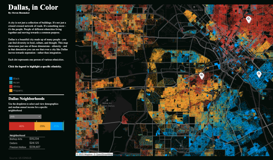 Steven Shoemaker created one of the most beautiful maps I’ve seen created in Tableau – it tells a compelling story. Not just of city buildings and roads, but of a city of the people who are working, living and co-existing together. I love how the beauty of the map serves as a stark contrast to the underlying story of segregation within a city that is celebrated for it’s diversity (named the fifth most diverse city in the U.S. in 2018)