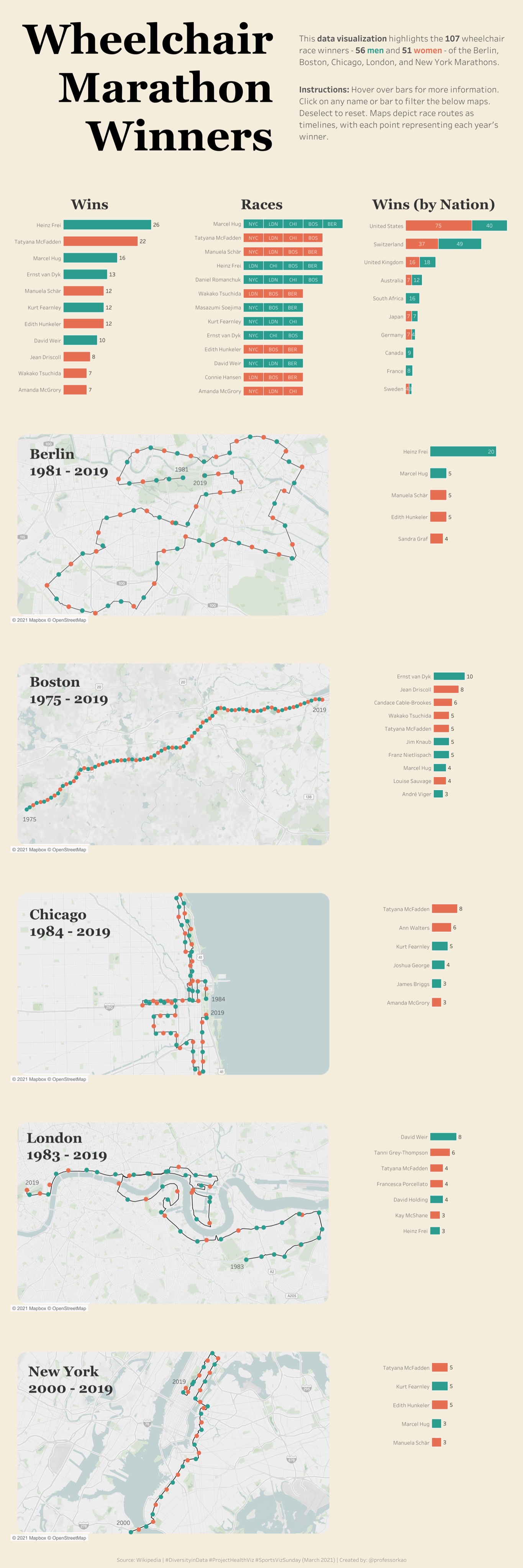 Dennis shows the various wheelchair marathon winners from 5 famous marathons across the world. He brilliantly shows the course details whilst including the athletes and respective years they won. How impressive to find Heinz Frei has won a total of 26 races, mainly in Berlin. I love the layout and colour choices in Dennis' viz. This was a submission across SportsVizSunday, ProjectHealthViz and DiversityInData.