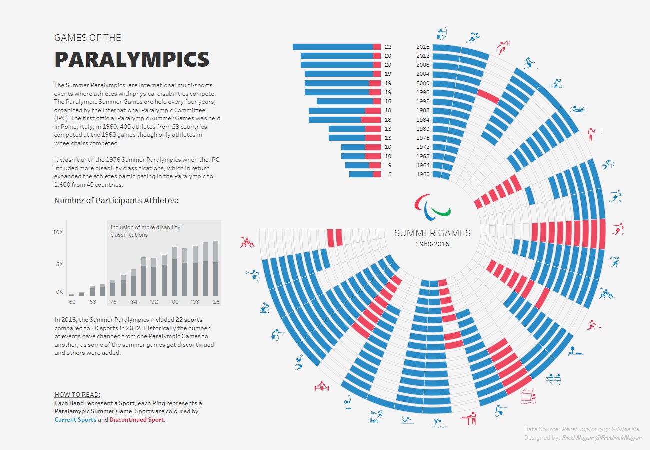 Radials are the way to my heart. Fred beautifully presented viz highlights the various sports included in the summer paralympics by year. I love the finer details of this viz including the sport participant vectors. I have become a real fan of where individuals make a 'showpiece' chart and then add smaller supplementary visual aids and text around the side for context. Fred does a great job of it here using a lighter grey text and greyscale bar.
